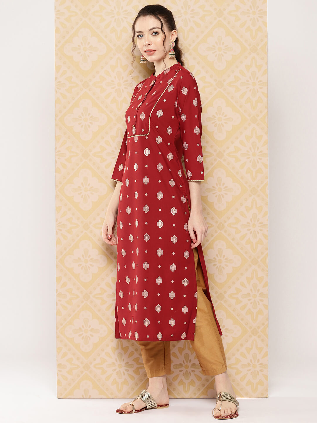 - Style:- Style:- Length: 45(inch) | Pattern: Foil Printed | Occasion: Casual | Type: Straight | Sleeve Type: 3/4th Sleeves Regular Sleeves | Color: Brick Red