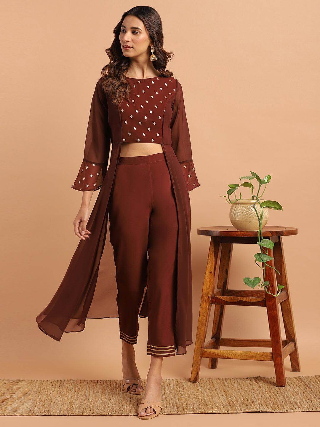 - Flaunt your new look with this splendid brown top and pant by Janasya. It is crafted in georgette with layer of poly crepe beneath it. Highlighted by gold print this top has bell Sleeve, round neck, and georgette flair. Completing the look it comes with poly crepe Pant which has gota patti lace on hems. Pair it up with cute bow sandals.