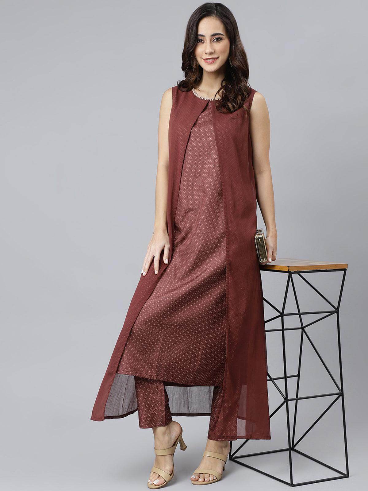 - Style your festive look into this beautiful brown foil printed poly silk layered kurta and pant set. The kurta has round neck, sleeveless, golden foil polka prints with solid georgette layering jacket attached to shoulder with A line silhouette. The pant is crafted in poly silk fabric featuring golden foil polka prints same as the kurta.