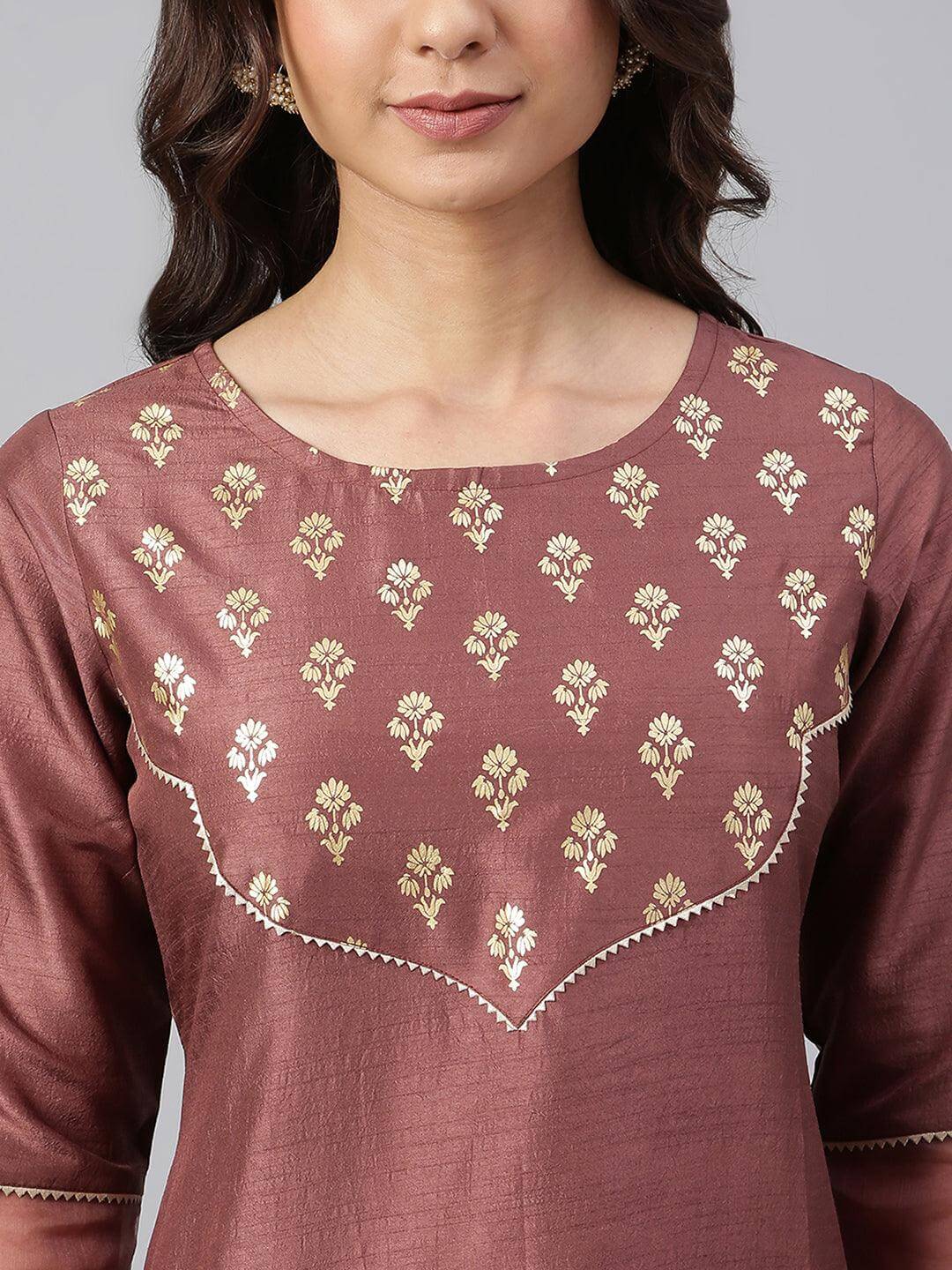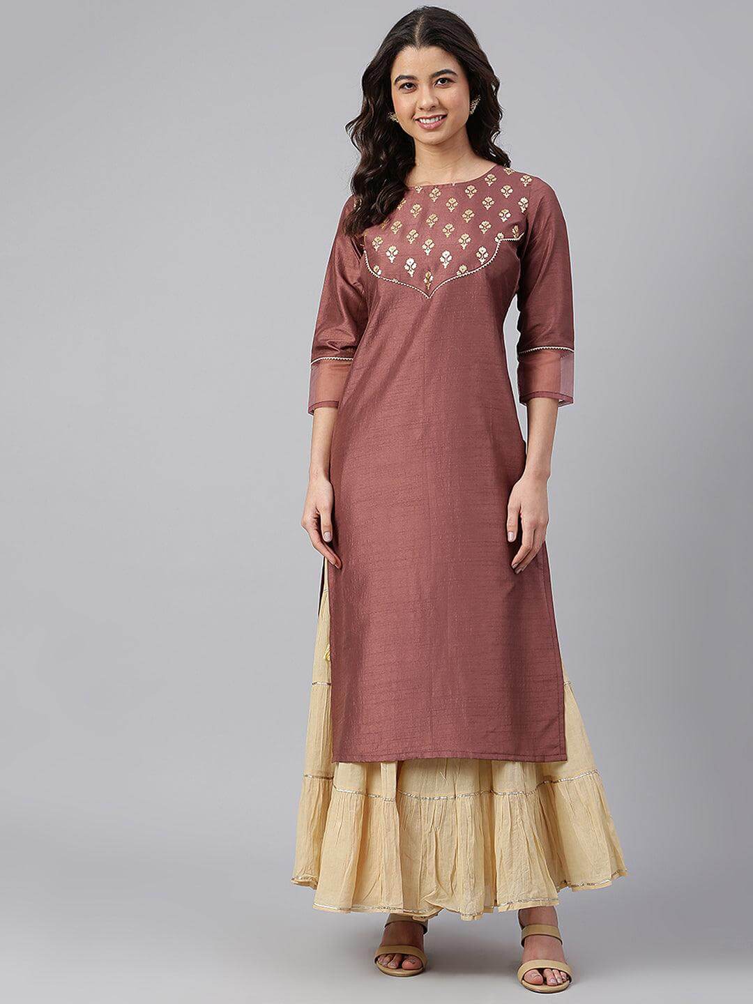 - Brown round neck poly silk kurta with gold foil print on the neckline with delicate detailing of gotta patti lace on yoke and sleeves. This kurta features 3/4th sleeves and straight fit. It is a perfect choice for a light festive look.