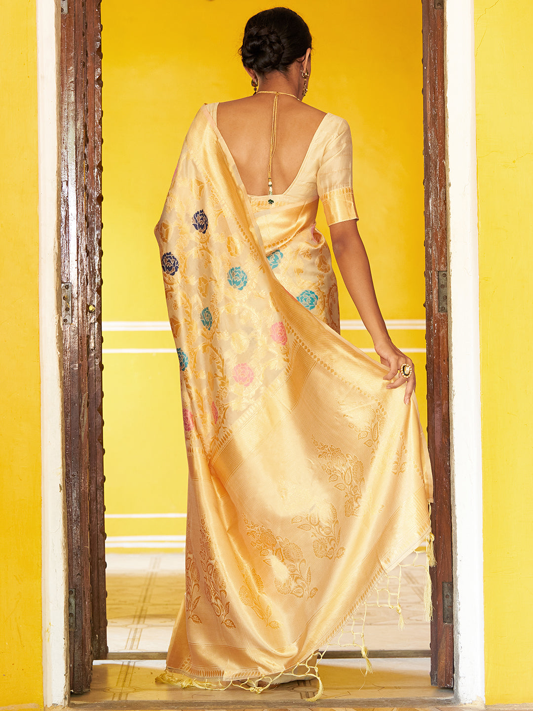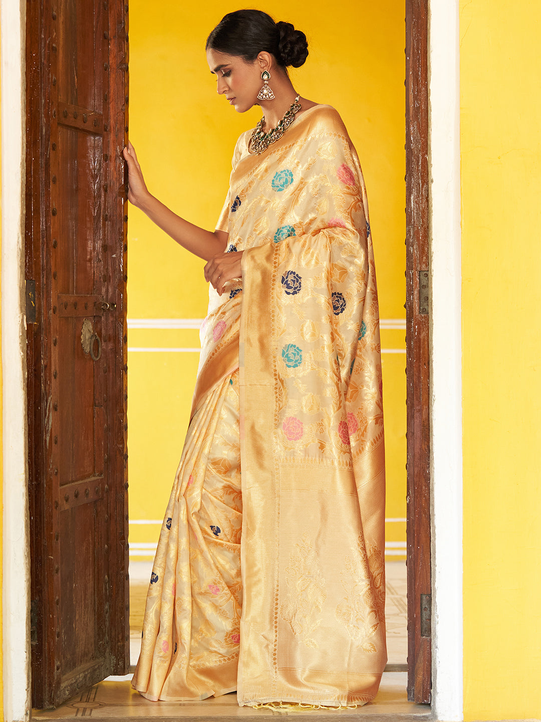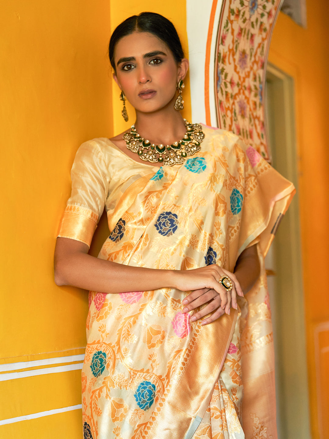 Cream Banarasi Silk Woven Floral Design Saree with Unstitched Blouse Piece