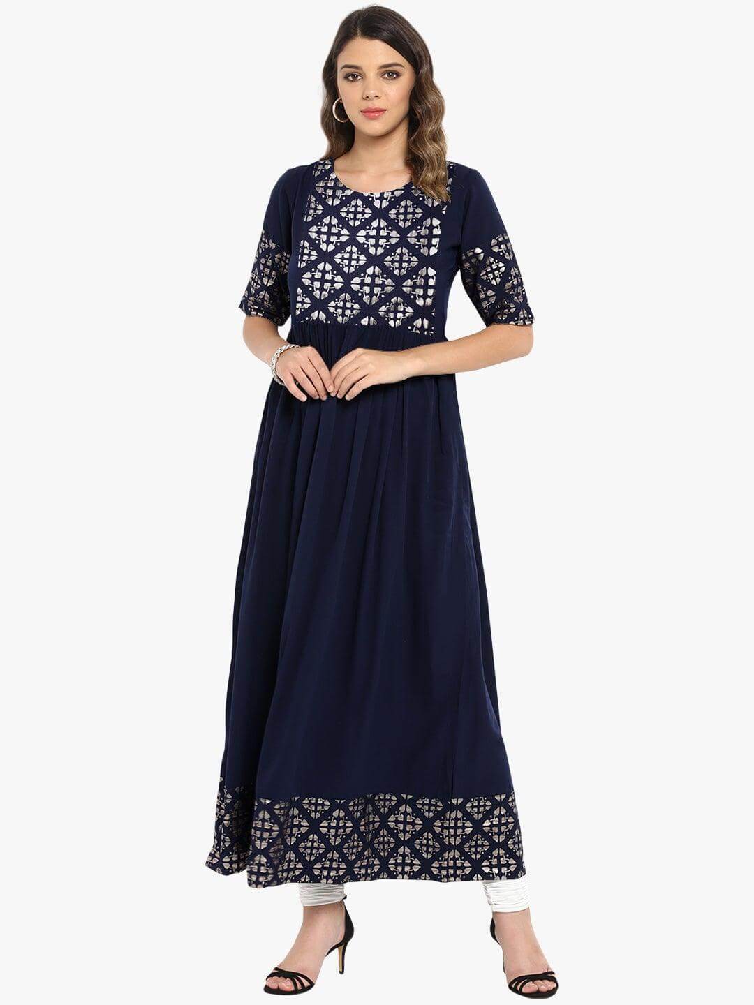 - This stylish foil print kurta from janasya is made of poly crepe and comes in an attractive dark blue color. It features half sleeve,round neck,flared and it is ankle length kurta that is suitable for casual occasions. Team it with matching leggings for a chic look.