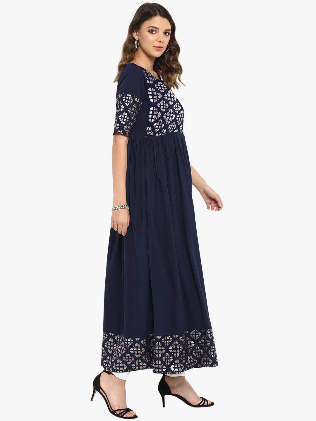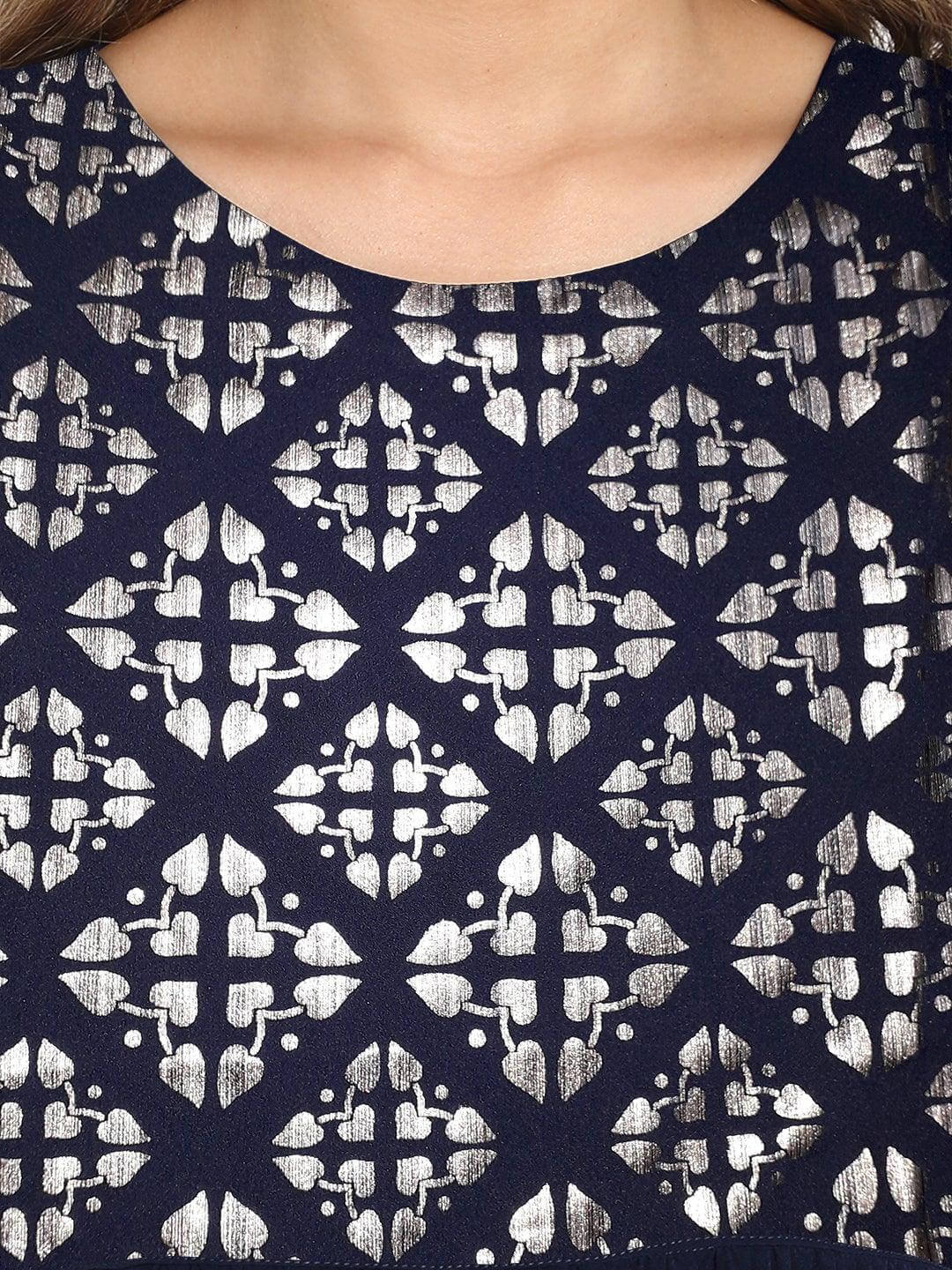 - Style:- Length: 54(inch) | Pattern: Foil Printed | Occasion: Casual | Type: Flared | Sleeve Type: Half Regular Sleeves | Color: Dark Blue
