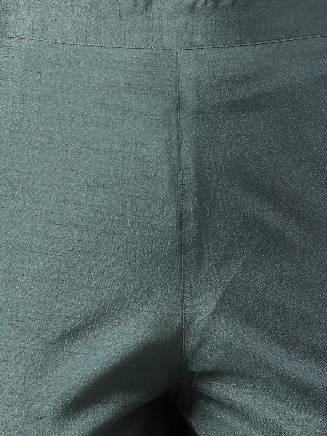 - Janasya is here to serve you this dark green poly silk kurta set. It features A-line flared kurta with tie-up with tassels at both the side of the kurta, round neck, 3/4 sleeves and beautiful embroidery and lace work on the yoke. It comes along with pants and contasting dupatta. Team it up with minimal accessories to complete the look.