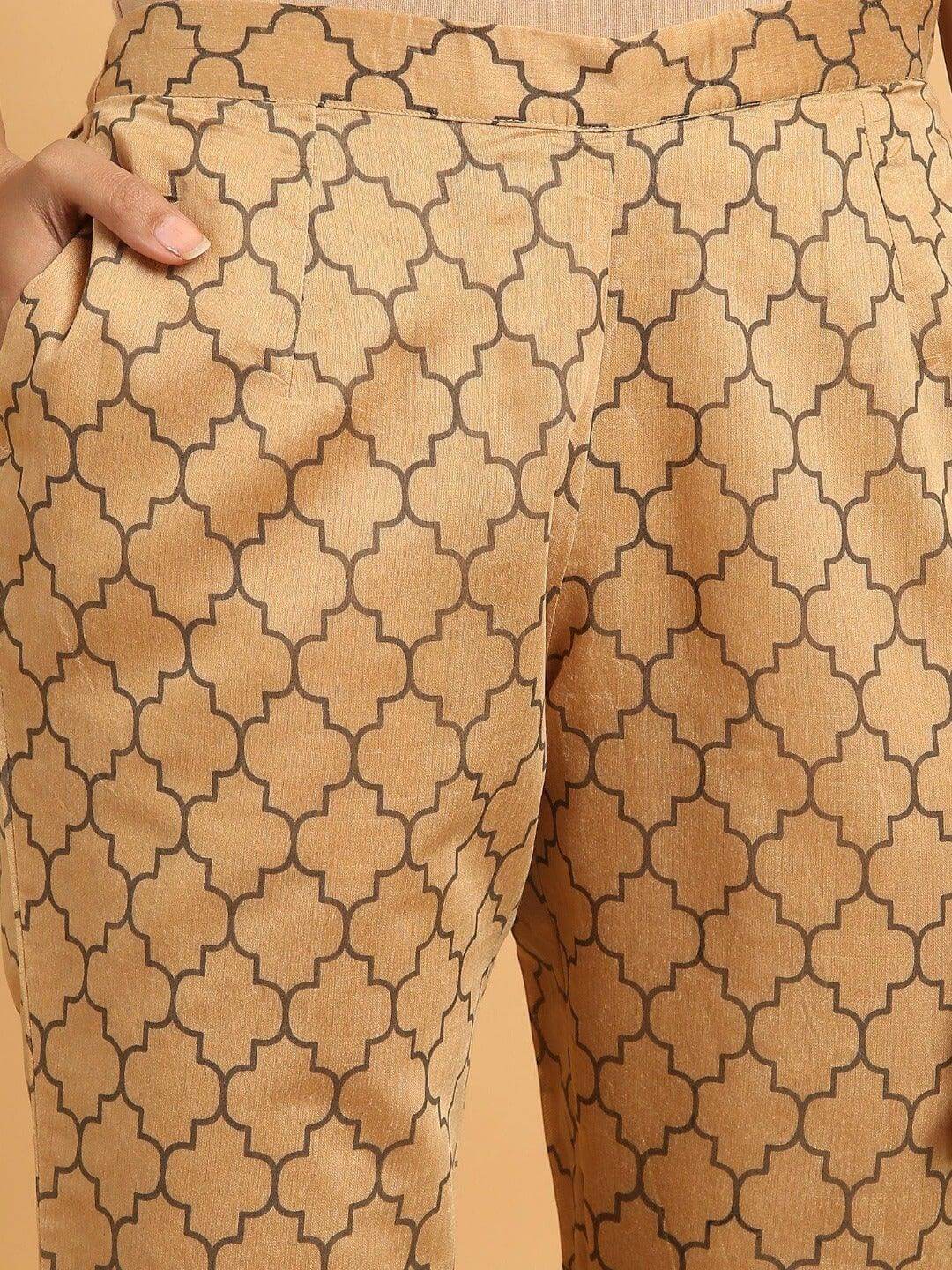 - An exploration of the modern vocabulary of design, this gold kurta and pant with dupatta from Janasya is sure to allure you. The three-fourth Sleeve, round neck with embroidered sequins yoke highlighted by lace add to its design. The set has cotton lining. The sheer organza dupatta with laced hemline adds to the overall look.The partially elasticated Pant comes with a side pocket and zipper closure. Match it with a pair of stilettos to complete the ensemble.