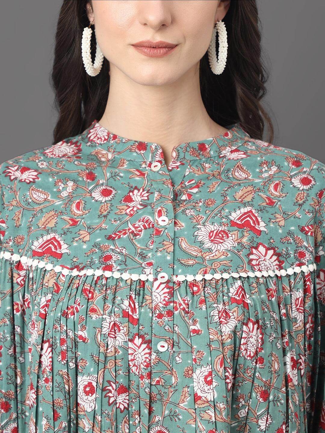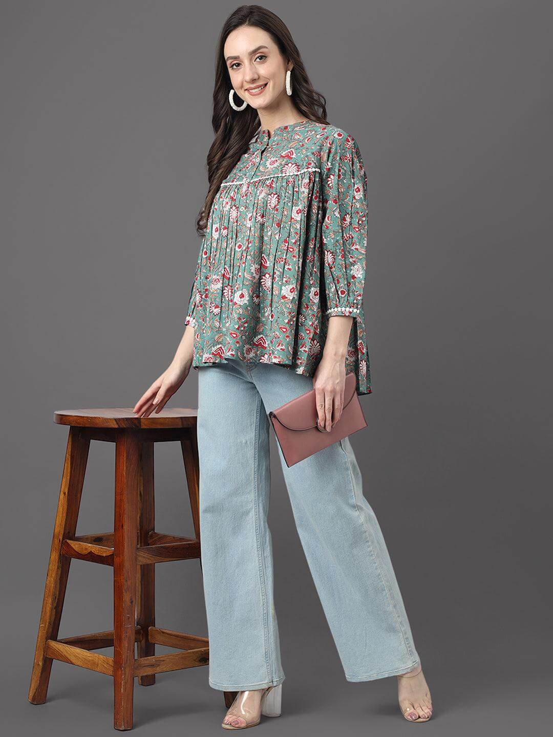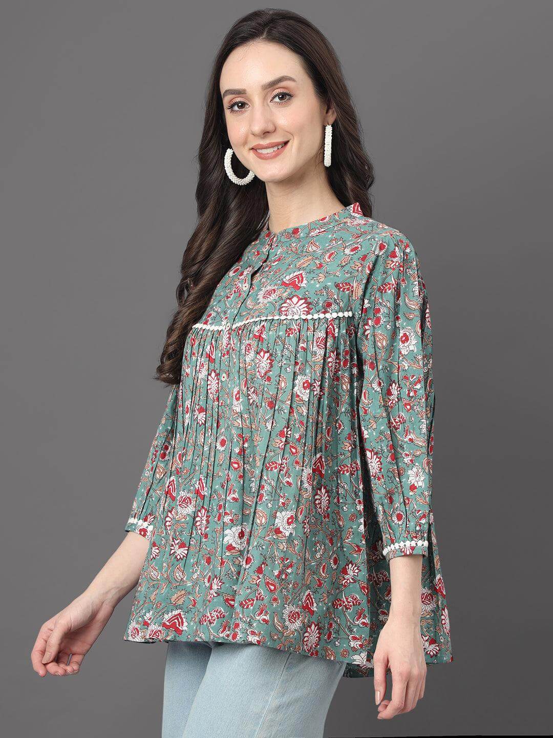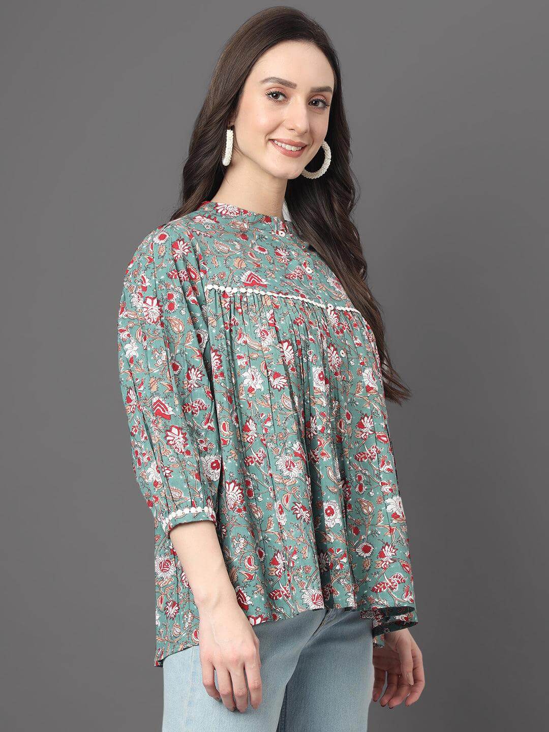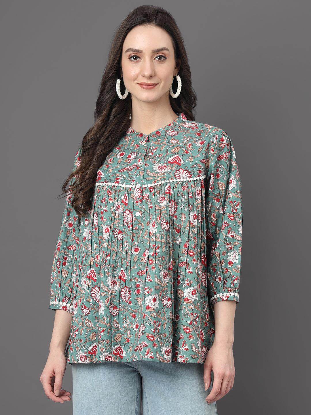 - This green cotton botanical print casual top by Janasya is a perfect addition to your wardrobe. Featuring 3/4th puff sleeve, mandarin collar, all-over prints, this top has gathered detailing at the yoke for an enhanced look with white lace detailing over yoke and sleeve hem. Pair it with jeans or casual pants for a chic look.