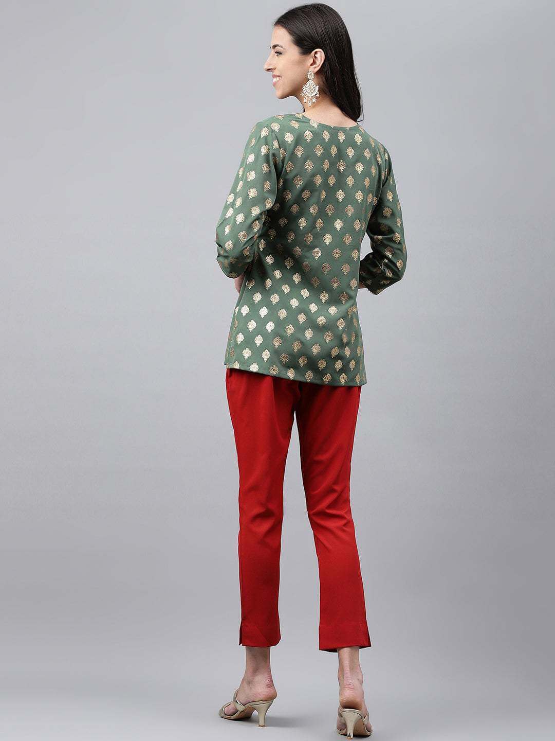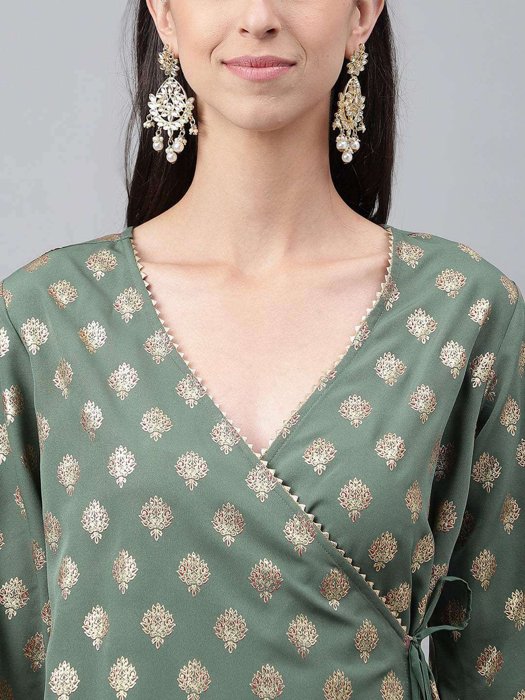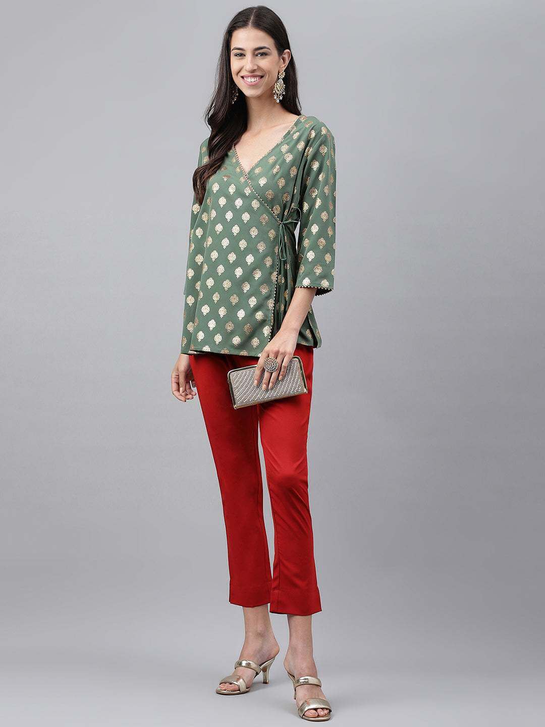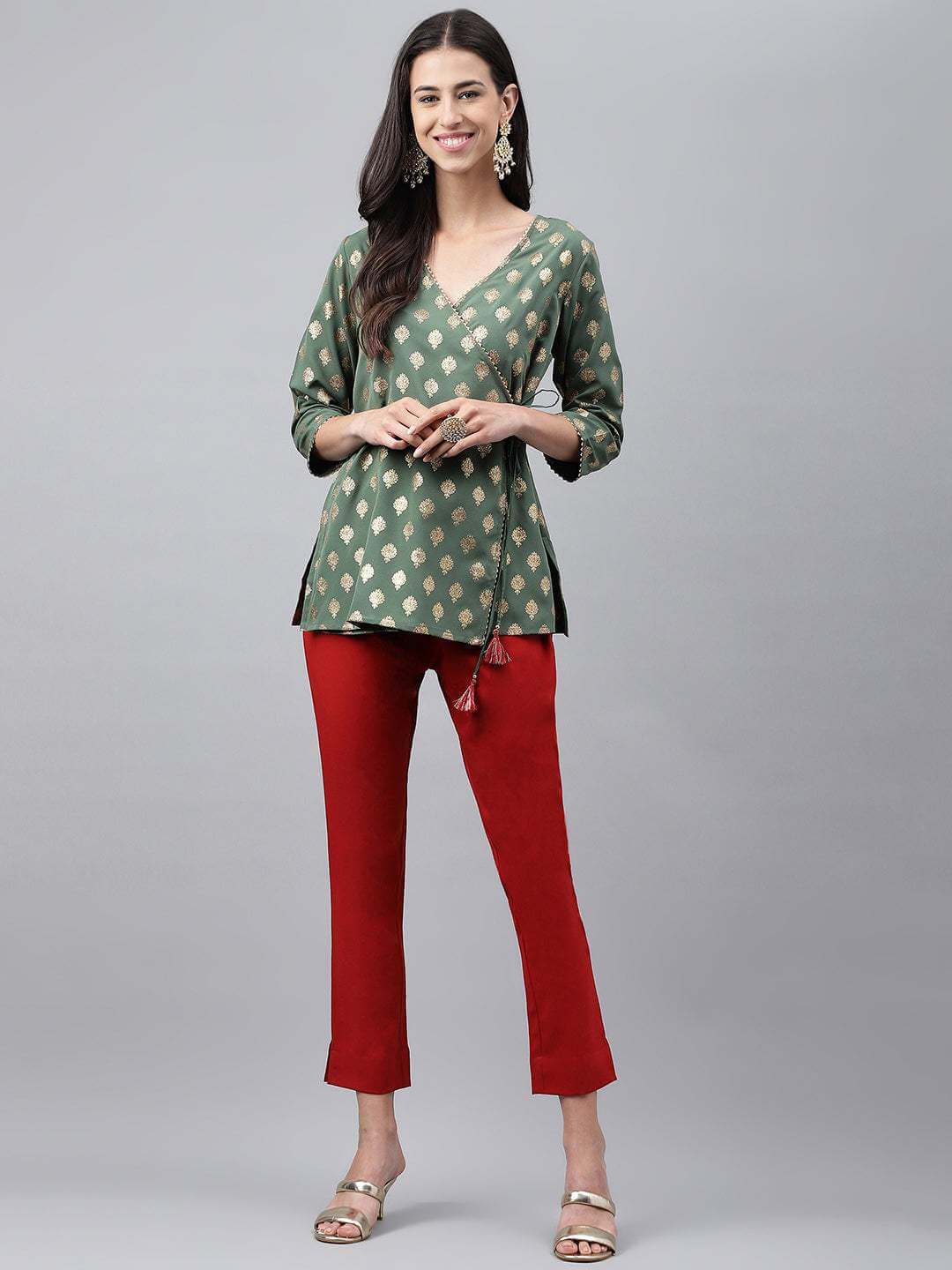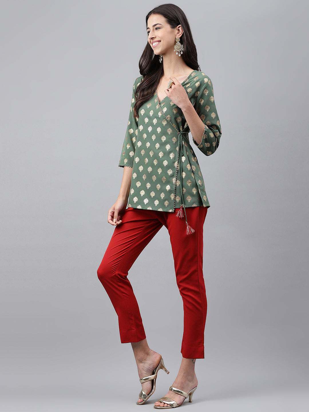 - Introducing our exquisite green crepe foil printed Angrakha style V-neck top, featuring 3/4th sleeves with delicate laces, tassels, and front open tie-up detailing. This top is made with a high-quality crepe fabric that offers a comfortable fit and a flowing silhouette that flatters every body type. The Angrakha style adds a touch of traditional elegance to the modern look, making it a perfect pick for any festive occasion or casual outing. The top is paired with maroon crepe pants that complete the look with style and grace. So, upgrade your wardrobe with this stunning outfit and make a statement wherever you go.
