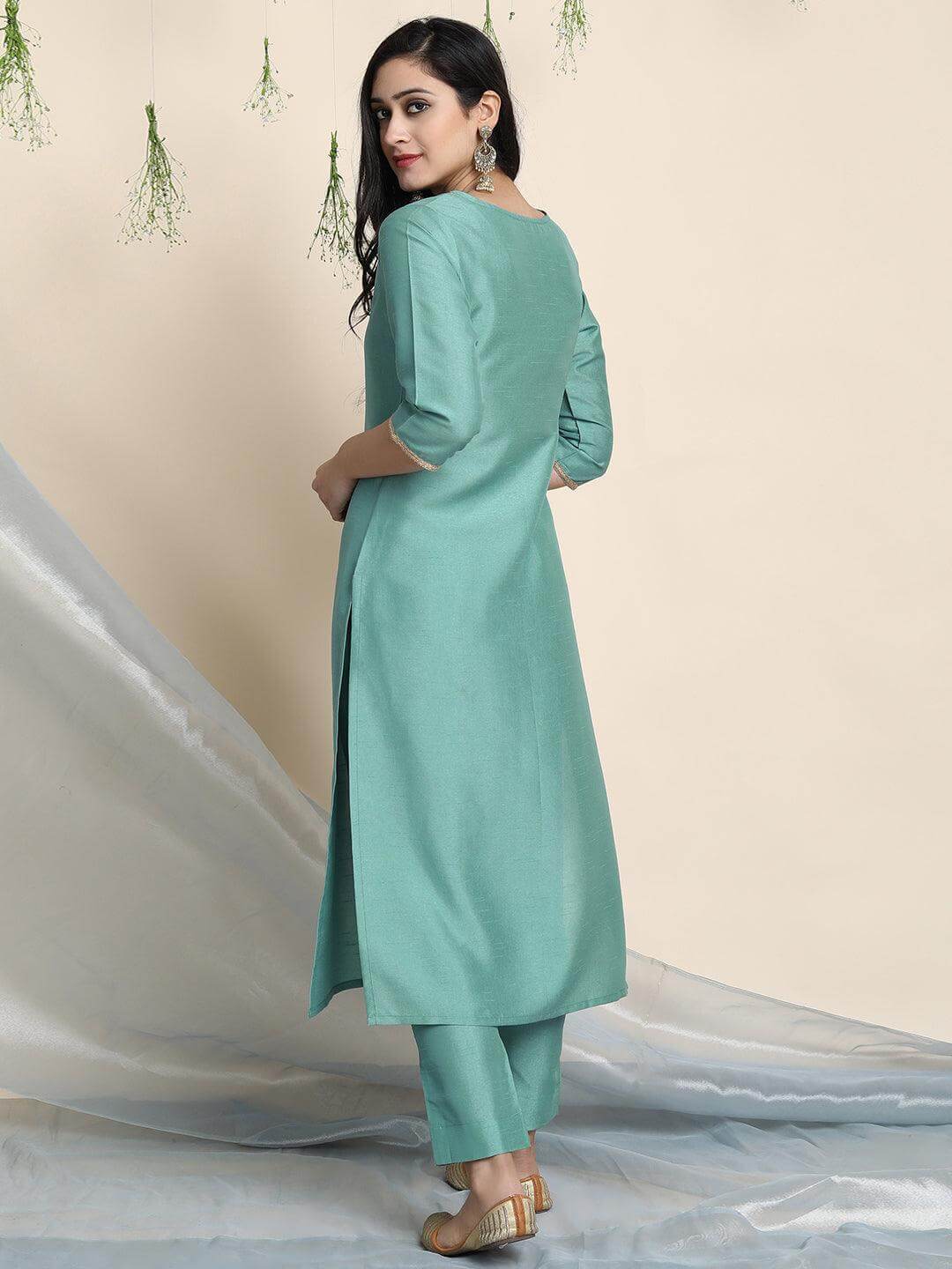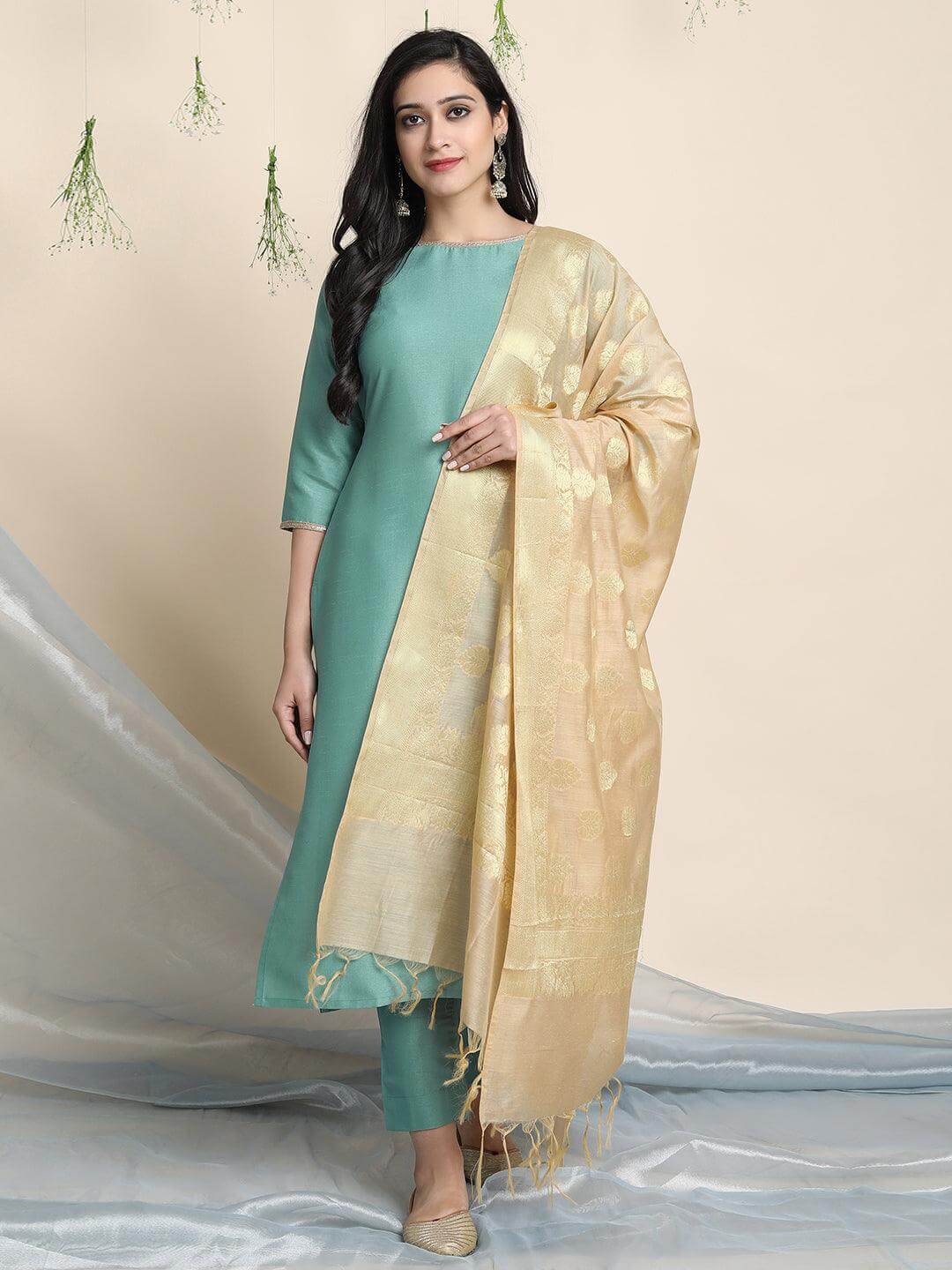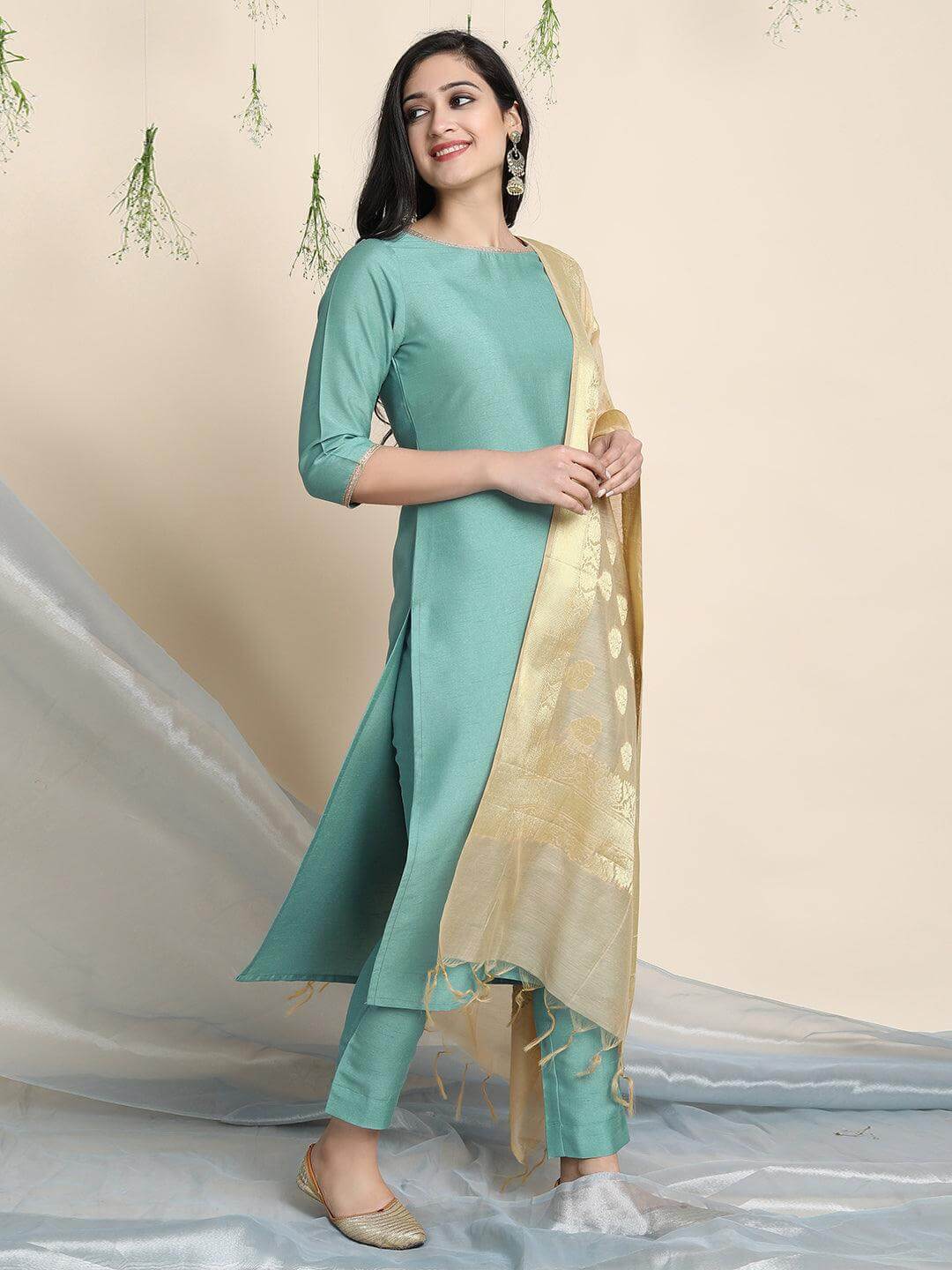 - Kurta Length: 44(inch) | Bottom Length: 36(inch) | Dupatta Color: Beige | Kurta Color: Green | Pattern: Solid | Occasion: Festive | Type: Straight | Sleeve Type: 3/4 Sleeves Regular Sleeves