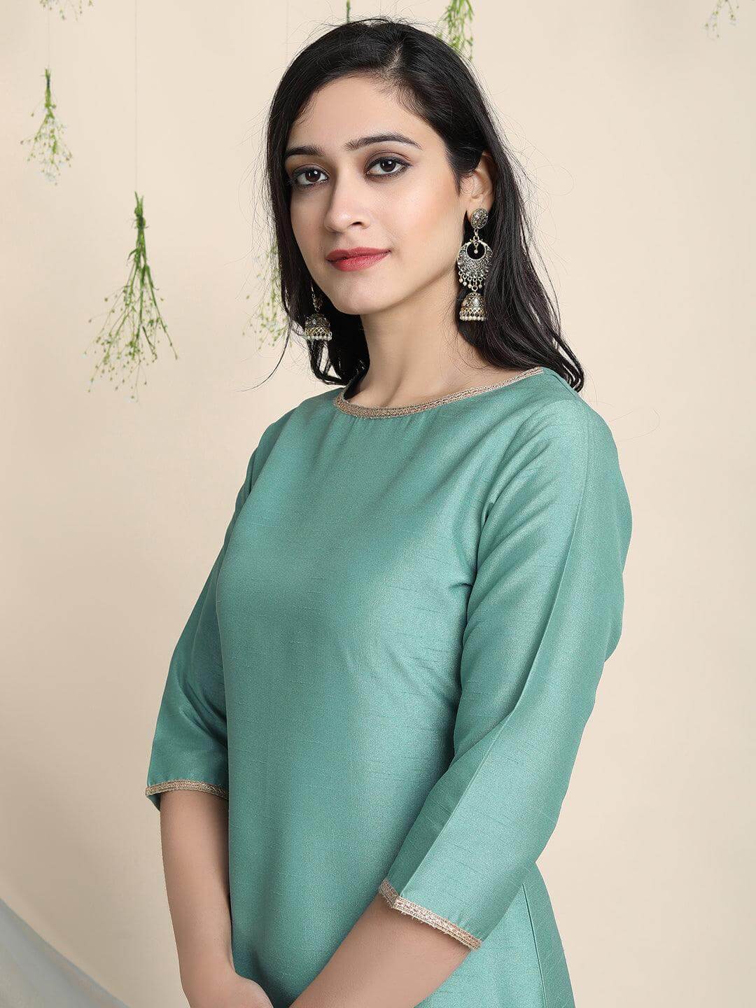 - An exploration of the modern vocabulary of design, this green slawar suit set from Janasya is sure to allure you. Tailored to sartorial perfection from poly silk, it features lace detailing on neckline and Sleeve hem and comes with beige woven art silk dupatta to highlight the solid kurta and pant. Pair it up with traditional earrings and mojris for complete ethnic look.