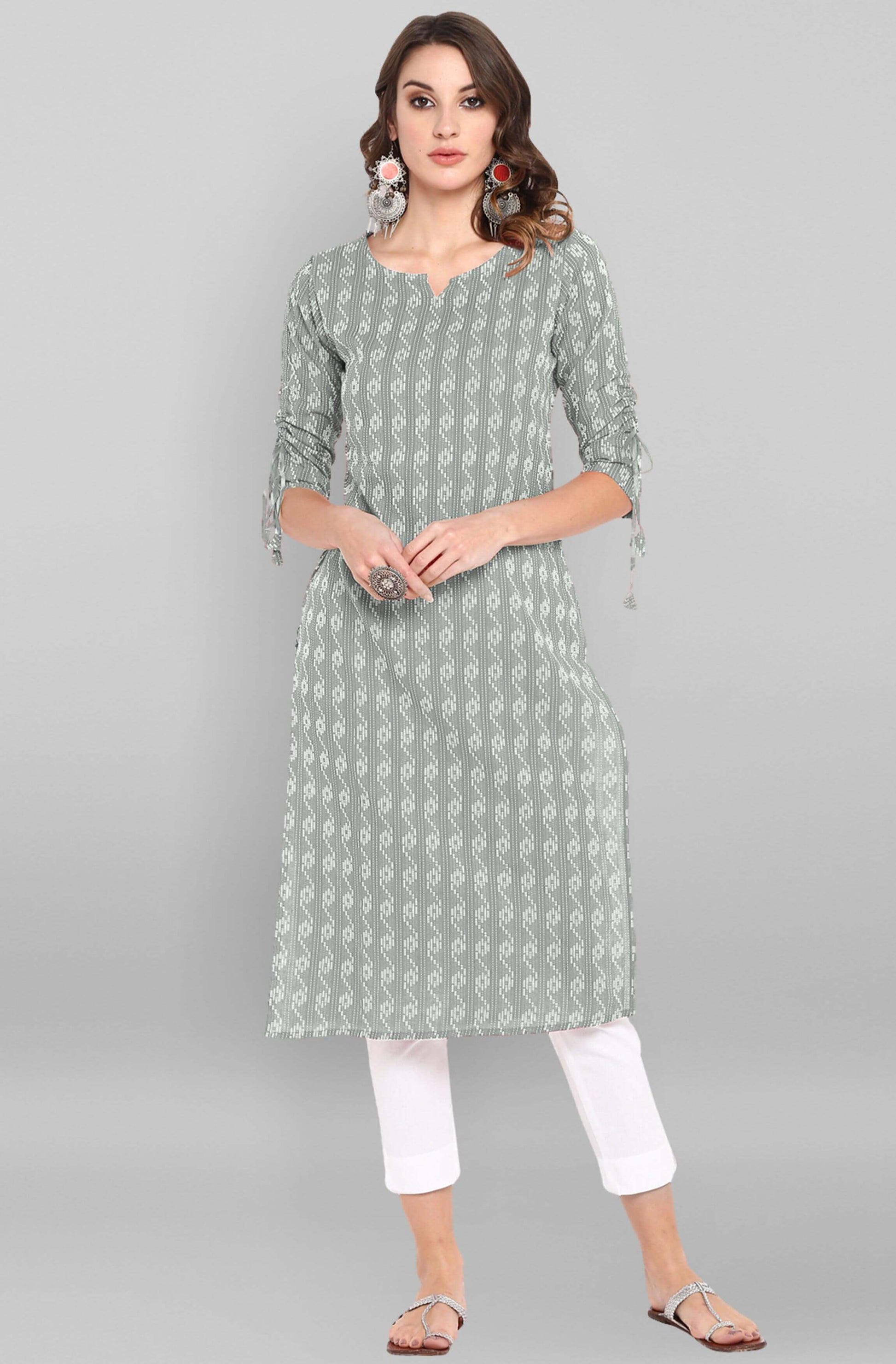 - This stylish woven design kurta from janasya is made of pure cotton and comes in an attractive grey color. It features 3/4 sleeve,v neck,straight and it is calf length kurta that is suitable for casual occasions. Team it with matching leggings for a chic look.