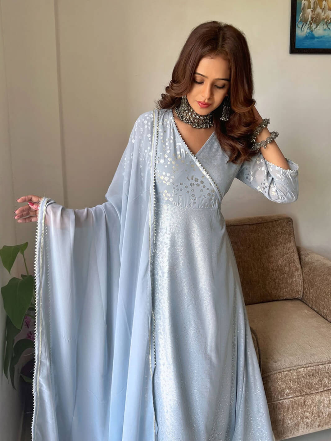 - Kurta Length: 52(inch) | Dupatta Color: Grey | Kurta Color: Grey | Pattern: Foil Printed | Occasion: Occasion | Type: Anarkali | Sleeve Type: 3/4 Sleeves Regular Sleeves