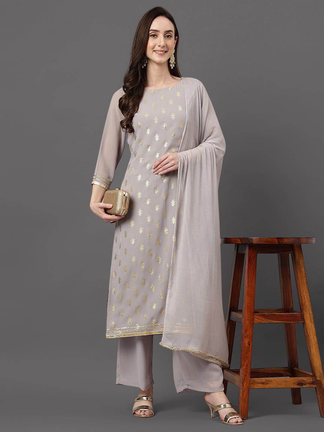 - Kurta Length: 45(inch),| Bottom Length: 37(inch) | Dupatta Color: Grey|Kurta Color: Grey | Pattern: Foil Print | Occasion: Occasion | Type: Straight | Sleeve Type: 3/4 Sleeves Regular Sleeves