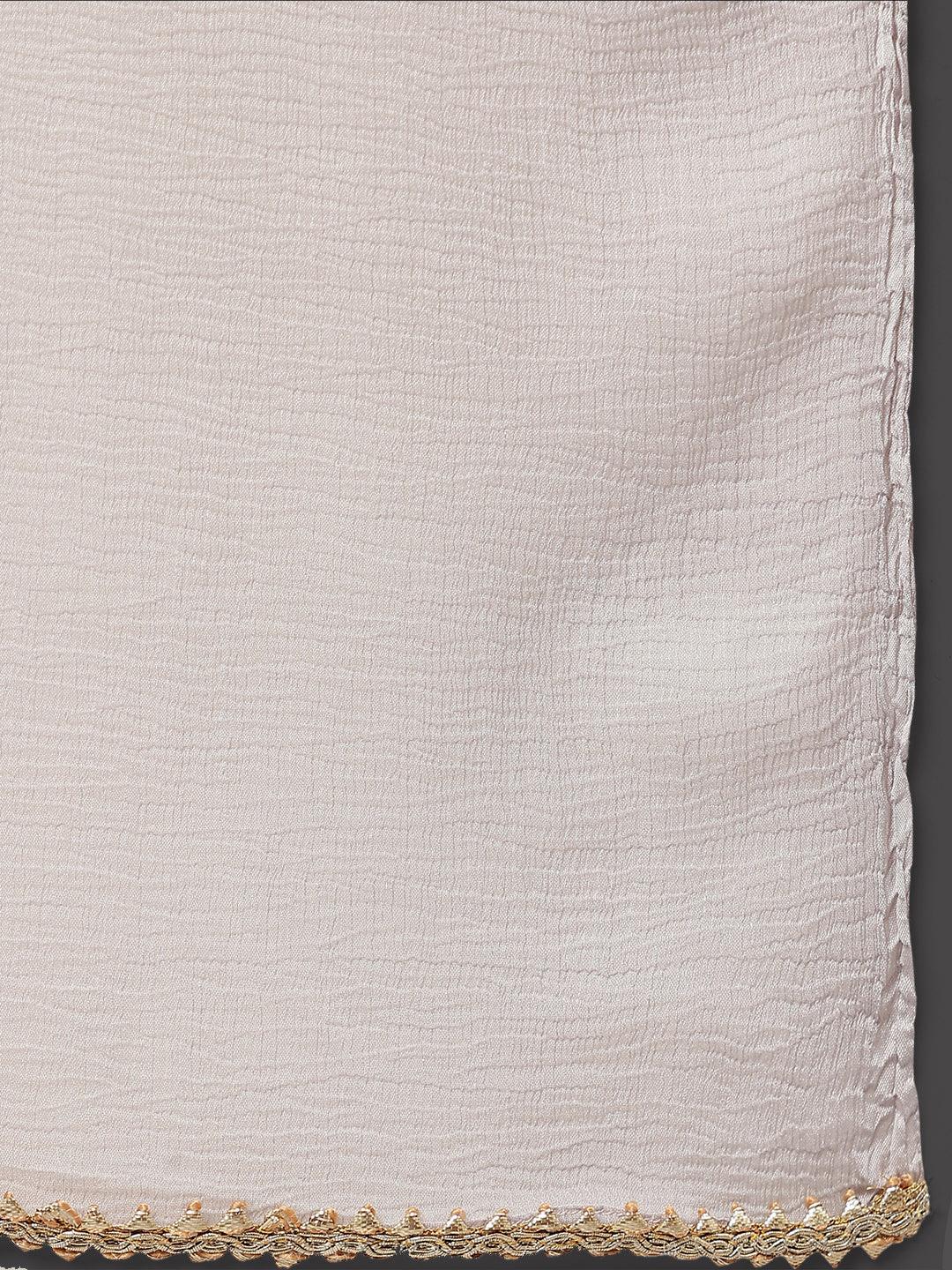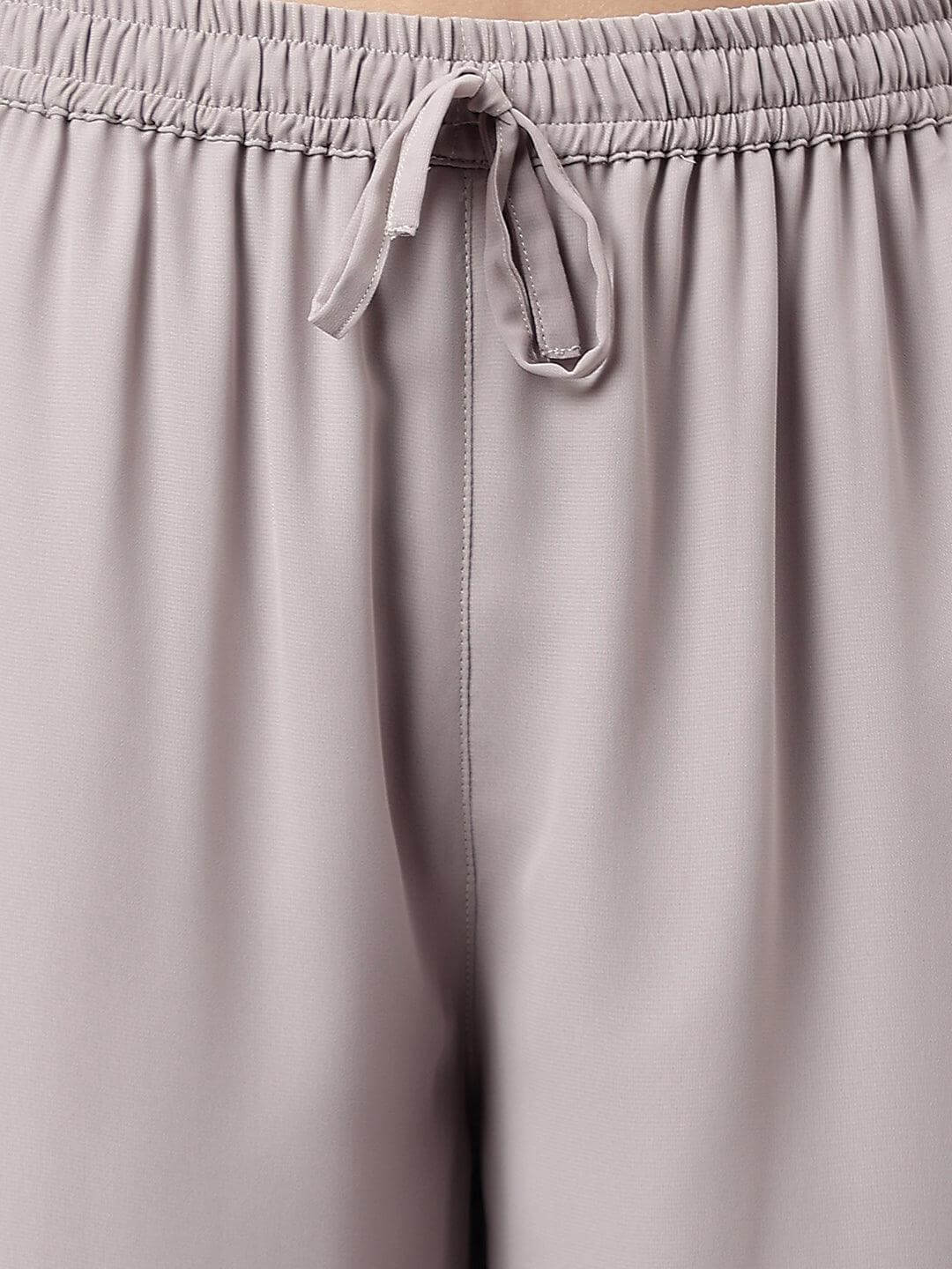 - This gorgeous grey georgette kurta palazzo set by Janasya is perfect for any special occasion. The straight cut kurta features 3/4 sleeves with gota detailing at sleeve hem and a boat neckline with beautiful golden foil prints all over at front panel. The set is completed with grey georgette palazzo and a chiffon dupatta with lace work at the border. The kurta and palazzo have a butter crepe lining in it. It is recommended to hand wash this elegant set.