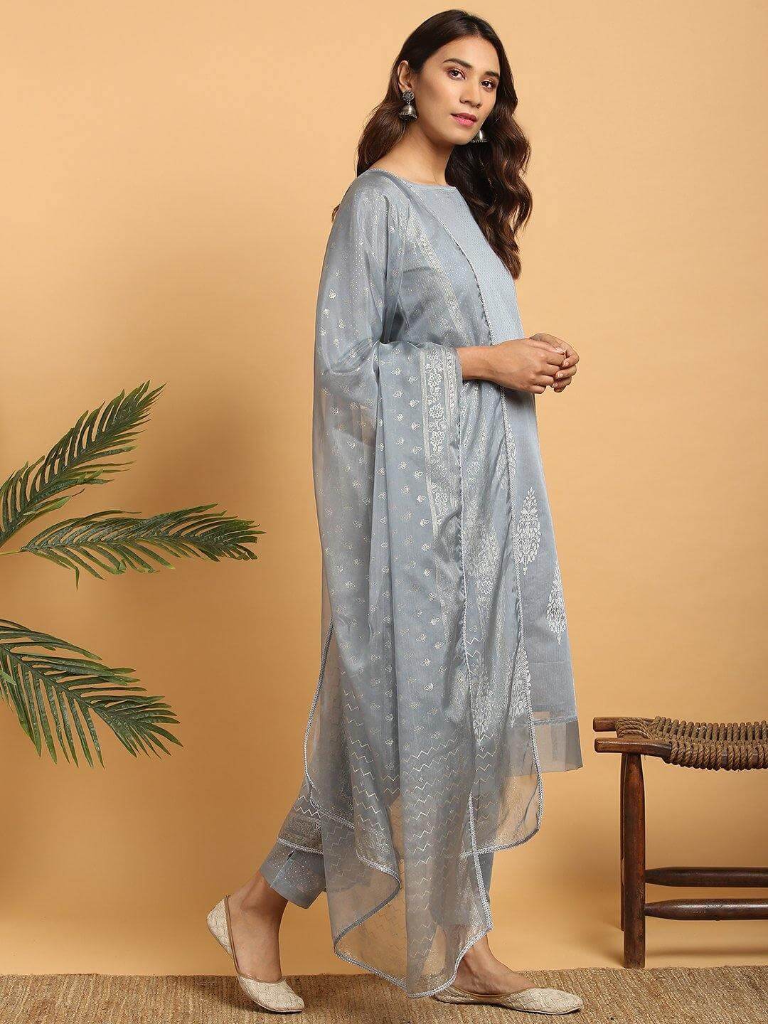 Grey Poly Chanderi Ethnic Motifs Kurta with Pant and Dupatta