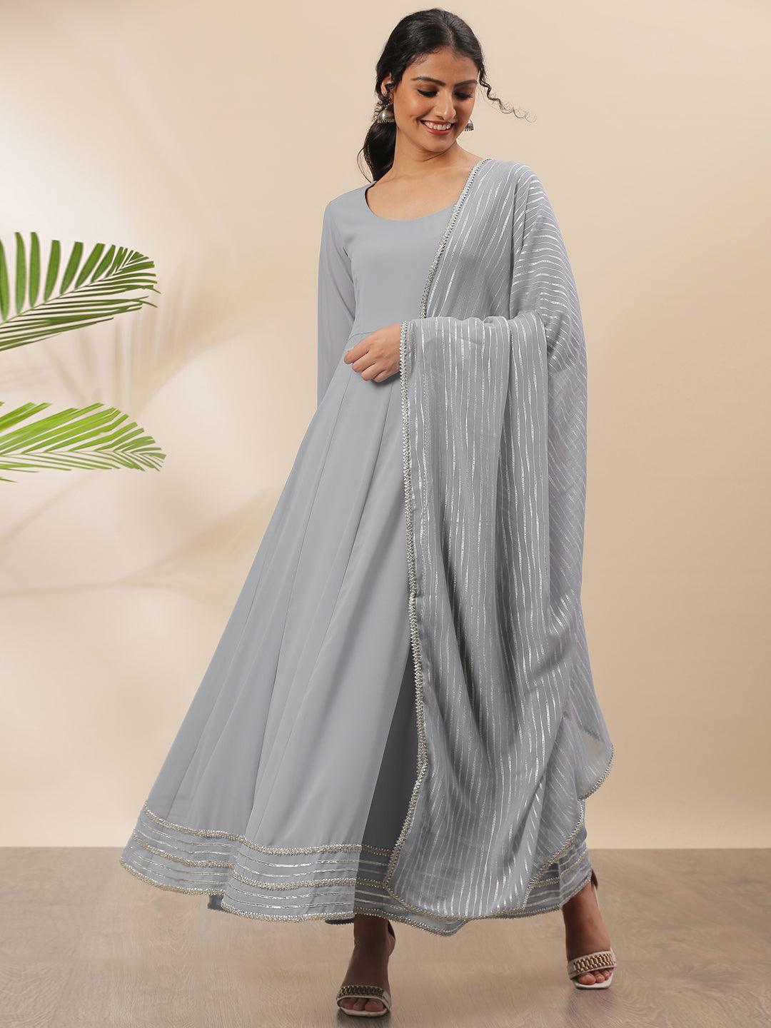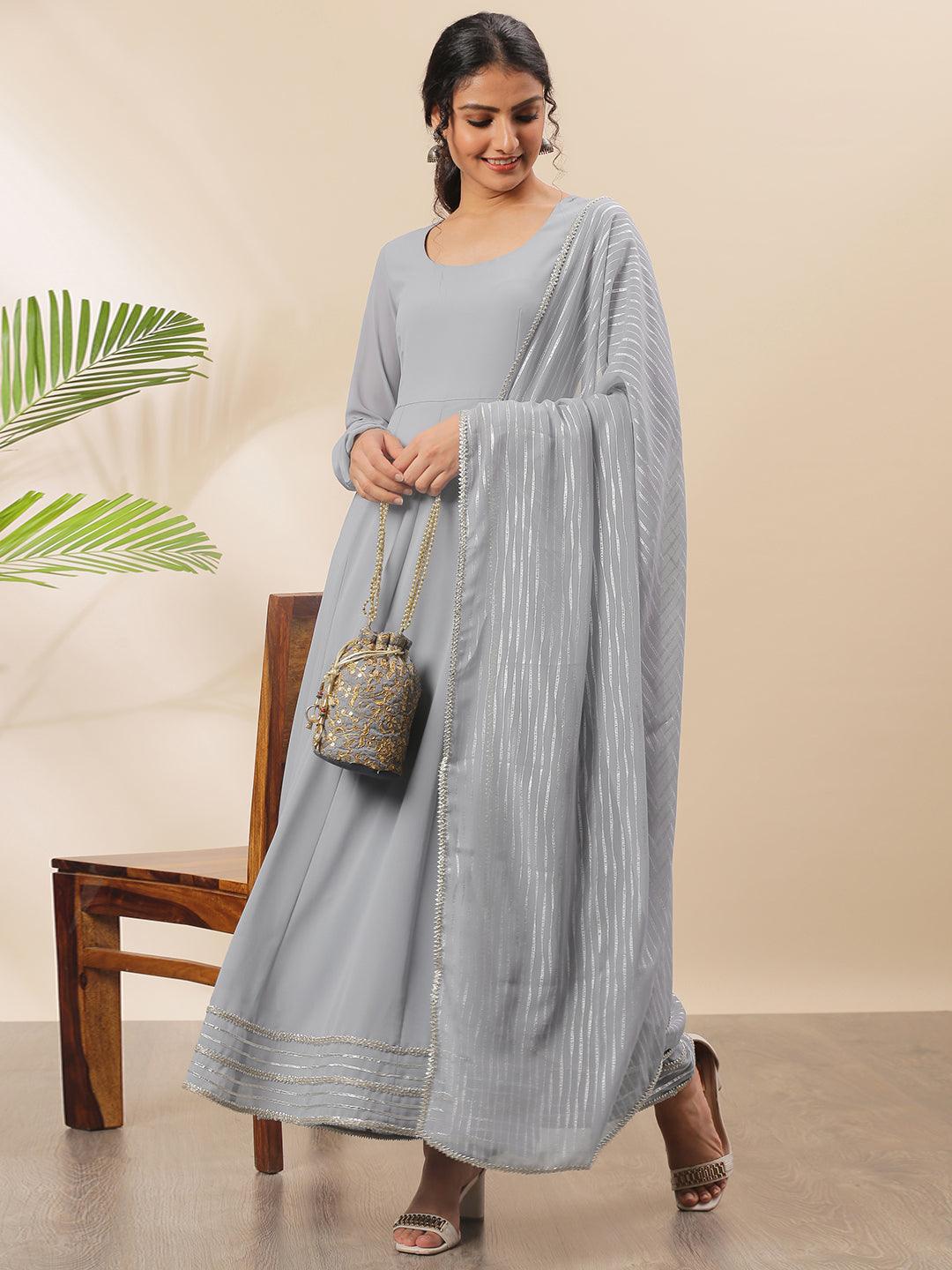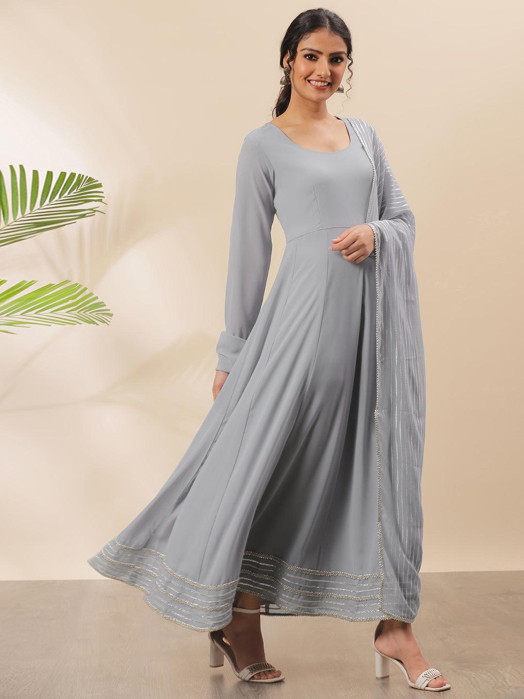 - Kurta Length: 54(inch) | Dupatta Color: Grey | Kurta Color: Grey | Pattern: Solid | Occasion: Festive | Type: Anarkali | Sleeve Type: Full Sleeve Regular Sleeves