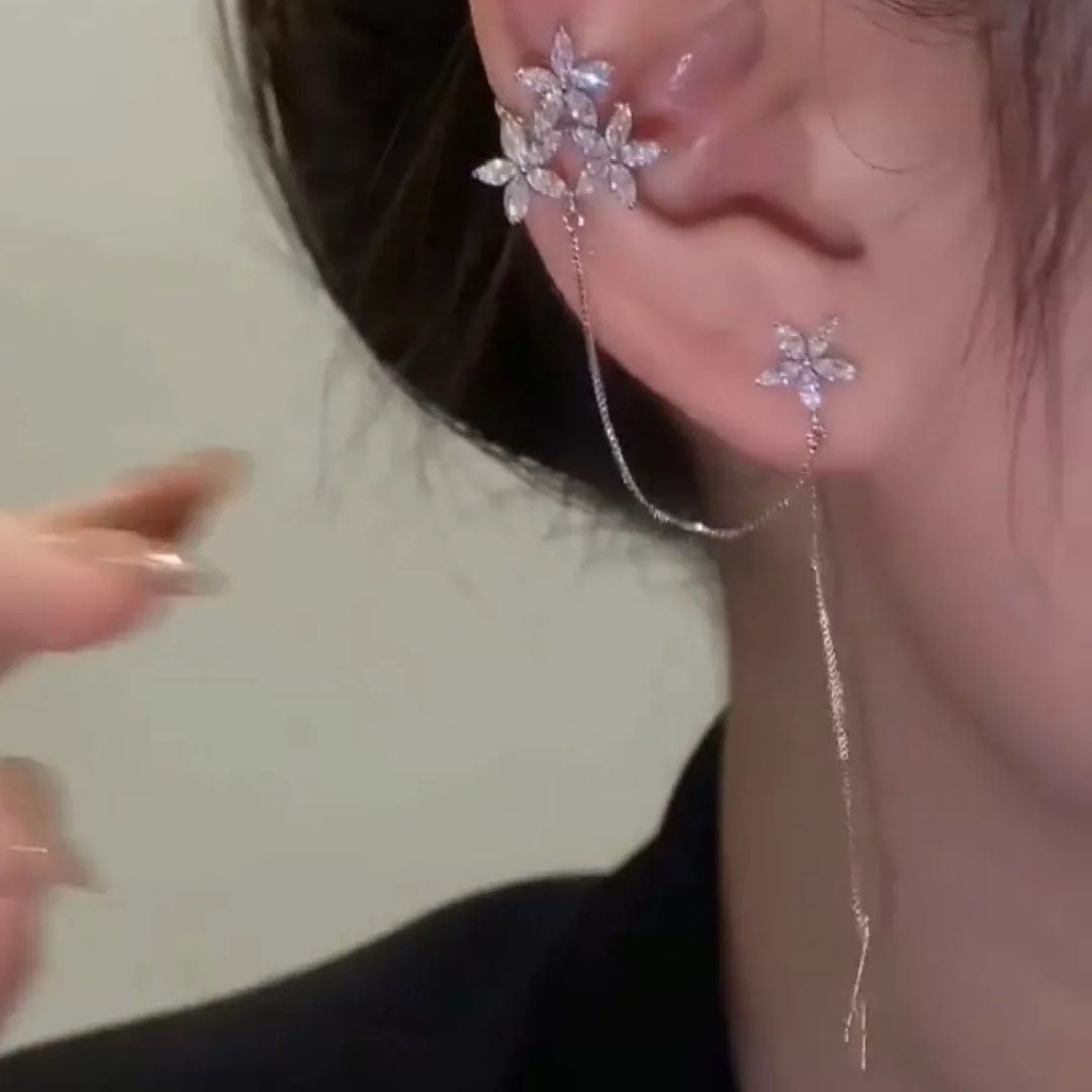 Korean Studded Three Flowers Chain Ear Cuff Stud Earrings For Women And Girls 2 Pcs/Set. Fashion Piercing Asymmetric Flowers Ear Cuff-This Pair Of Ear Crawler Studs Earrings Is For Pierced Ears. Cute And Unique Ear Climbers With Clear Cubic Zirconia, Elegant Huggie Dangling Earrings For Women And Girls. The Sparkling Stones Can Highlight Your Appearance, Grasp Everyone's Eyes In Your Party. The Stylish Design Complements Any Look And Makes A Great Fashion Artwork, Which Suits For Any Age Women And Girls.