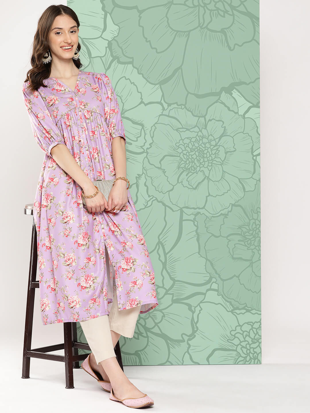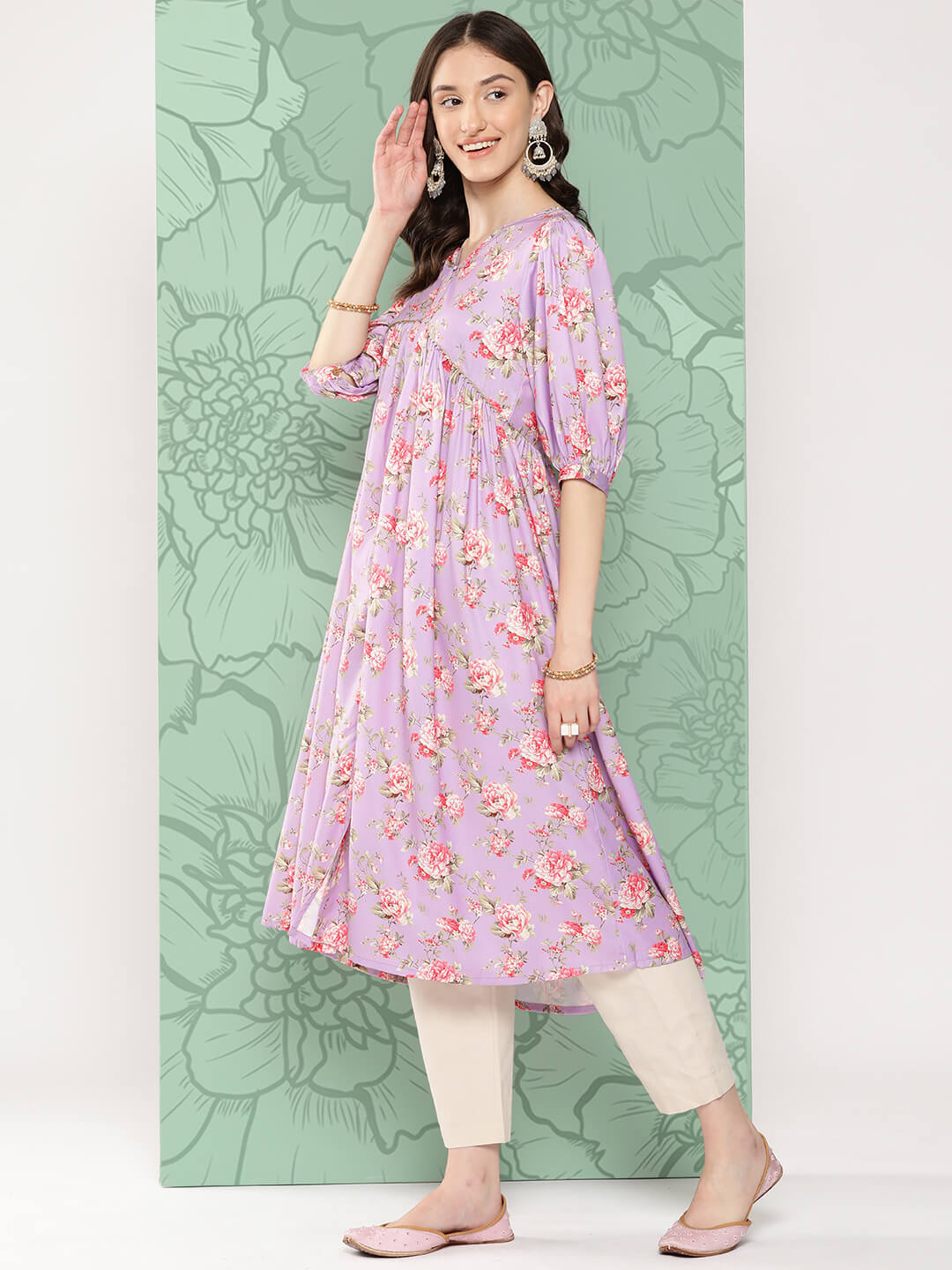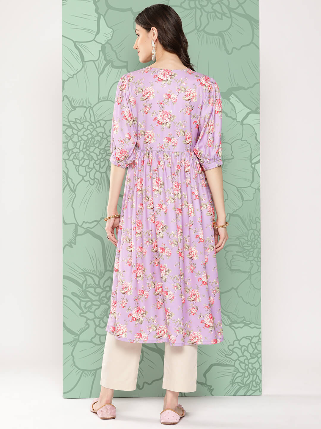 - Give your festive style a twist with this lavender moss digital floral printed flared kurta by Janasya, crafted in lightweight moss fabric featuring digital floral prints all over, V-neckline with gota-lace detailing and potli buttons at the front panel, half puff sleeves with fit and flared silhouette. Pair it up with any solid narrow pants to complete the look.