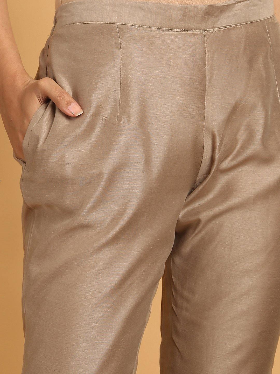 - Exhibit a vibe of urbanity with this light brown suit set from Janasya. Tailored from premium quality chanderi fabric, it assures a soft and soothing touch against the skin as it has soft cotton lining. The sequins handwork on the neckline in asymmetrical style adds to its appeal. The three-quarter Sleeve and delicately embroidered organza dupatta along with pocketed Pant further speak for themselves.