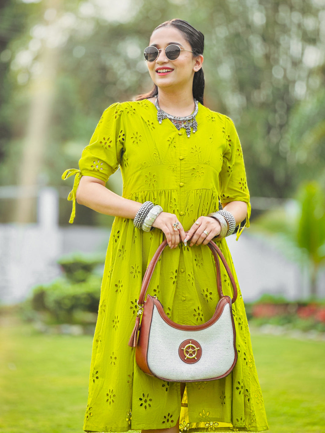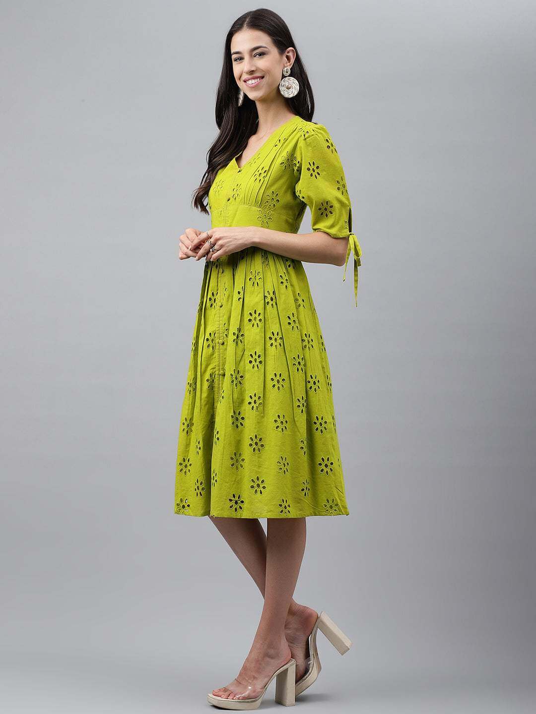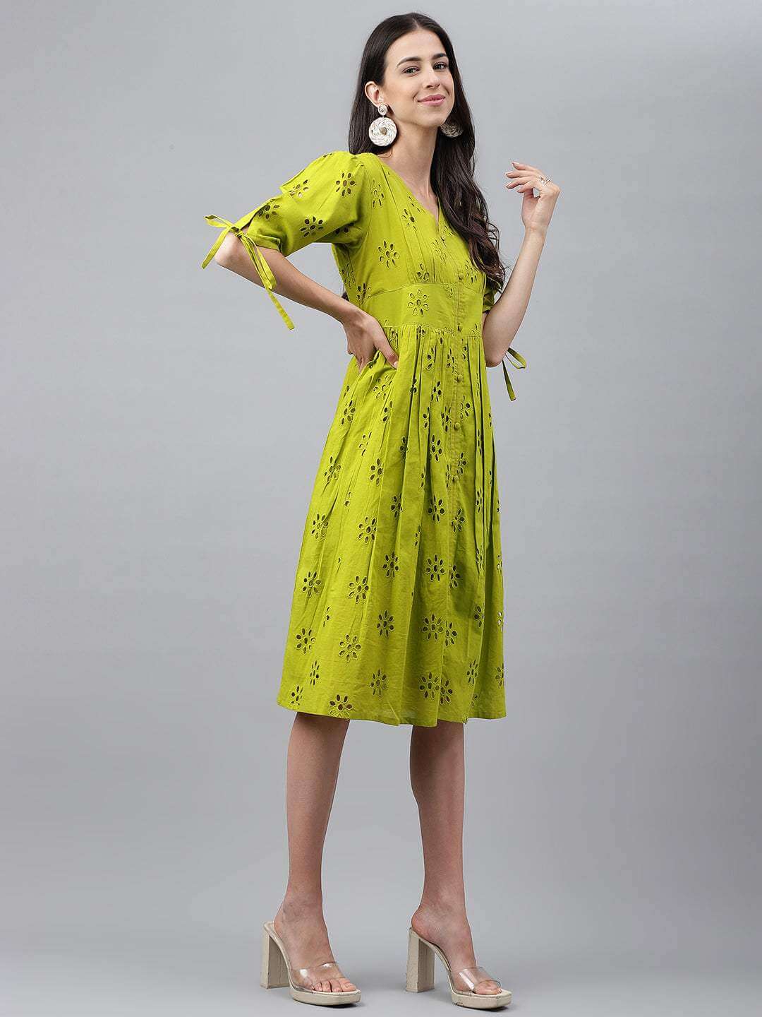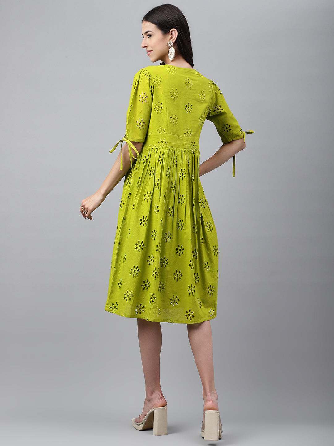 - This lime green cotton schiffli flared western dress by Janasya is an ideal casual wear for any day outing. The dress is crafted in cotton fabric with Schiffli work , has a v-neckline, half tie-up sleeves with button detailing at the front panel, gathers at the waistline to add flare to the silhouette. It has mul cotton lining inside to give comfort and to make you stand out with its unique style.