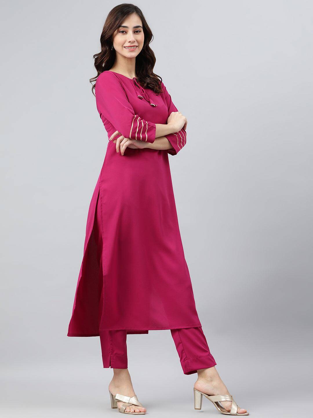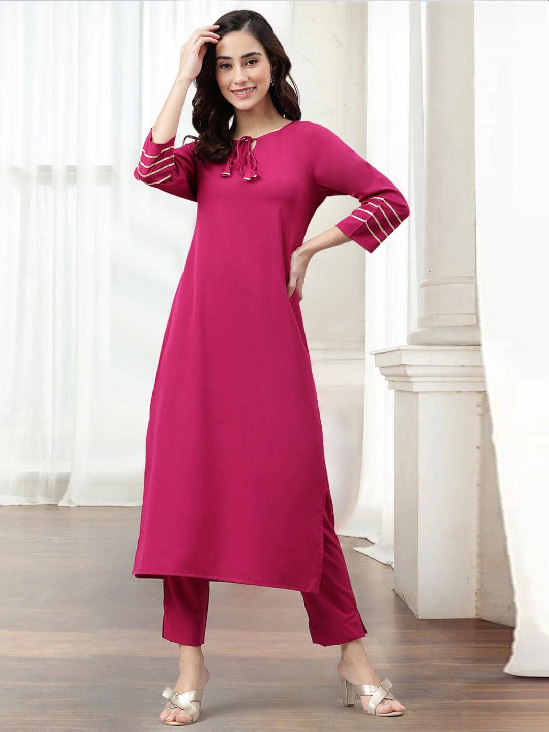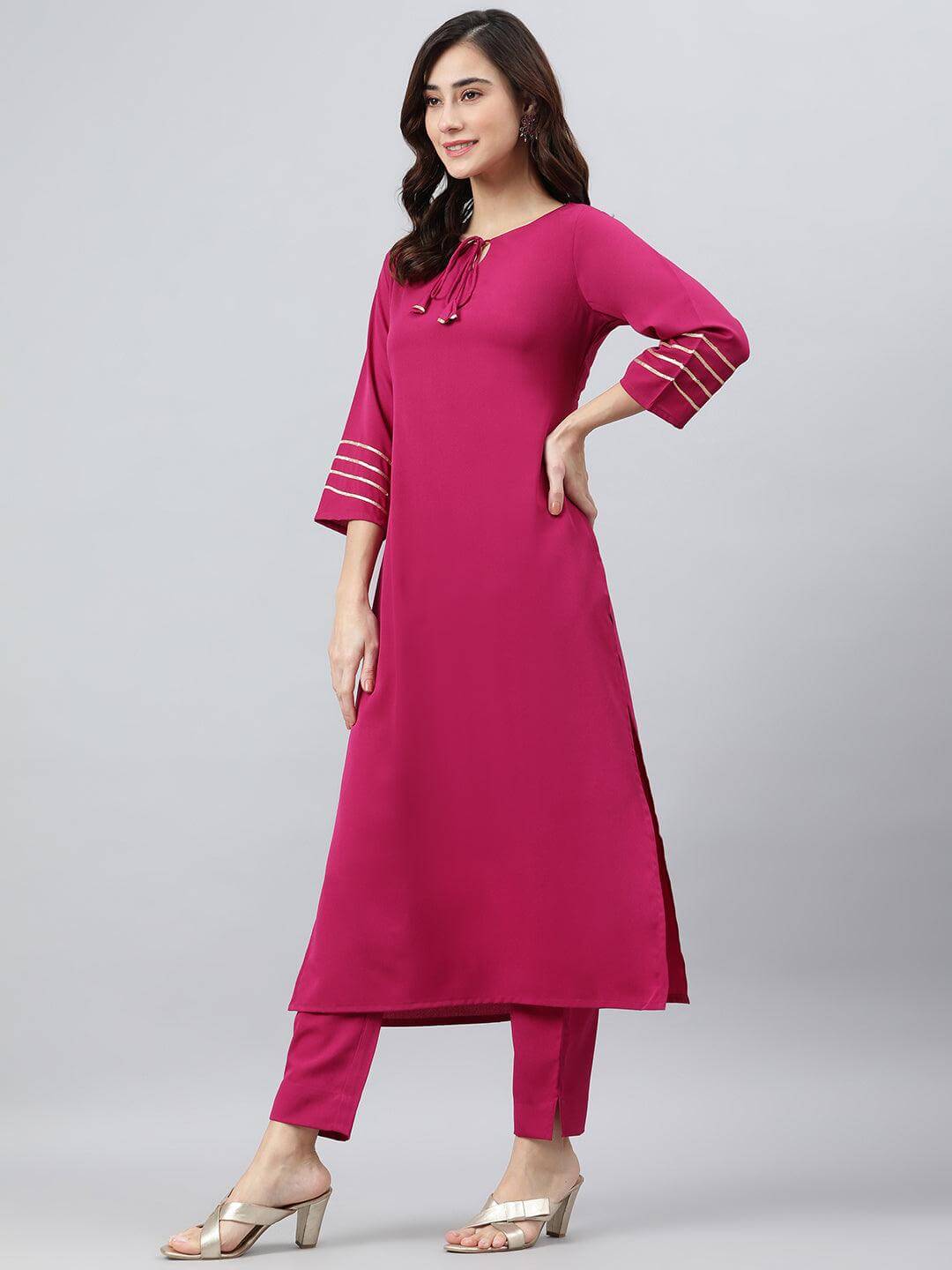 - Go #hyperpink with this cutting edge magenta colored poly crepe straight kurta set with tie-up neck adorned by tassels. It has gota patti details on Sleeve and tassels. This calf length kurta has 3/4 Sleeve.