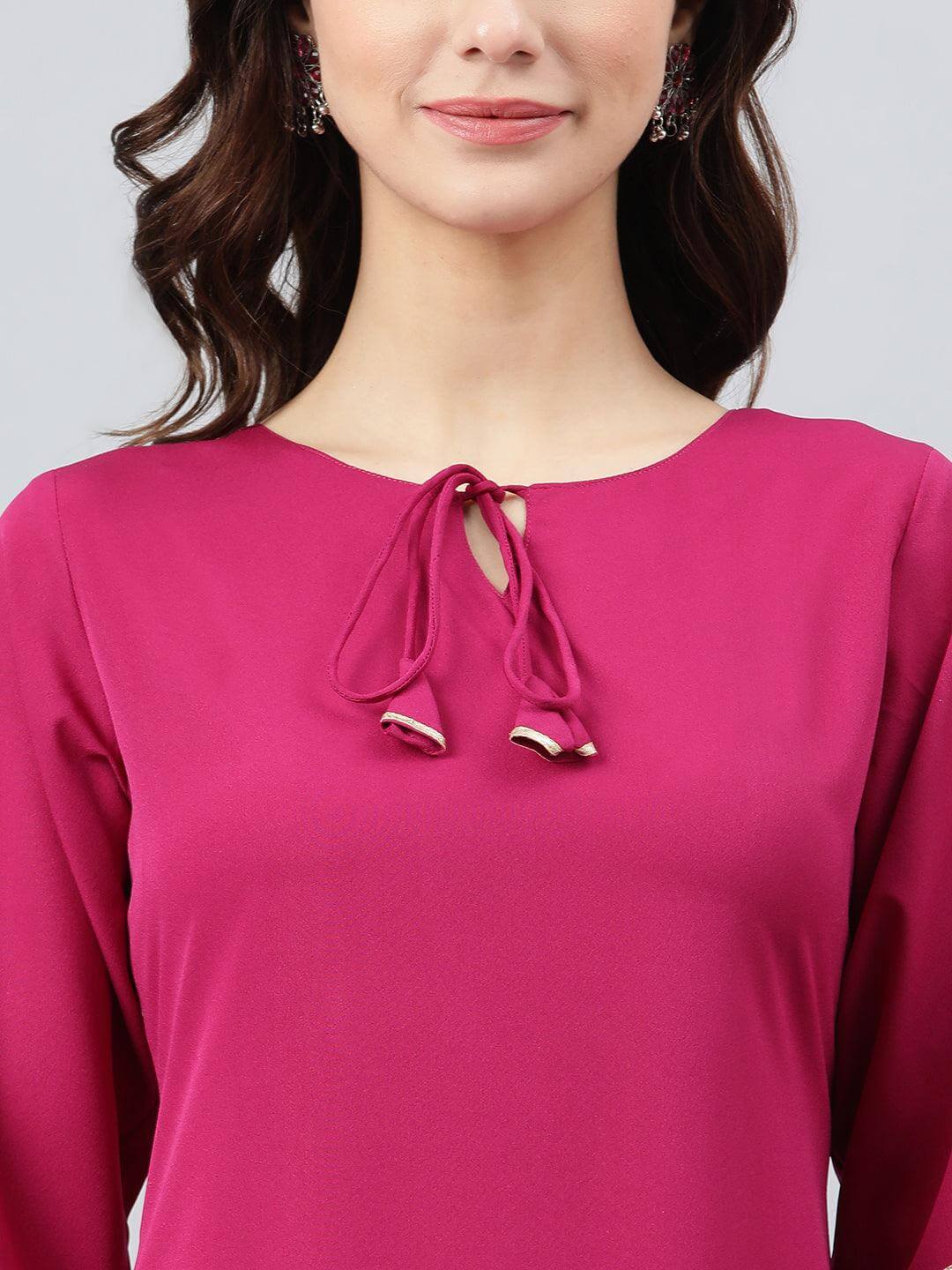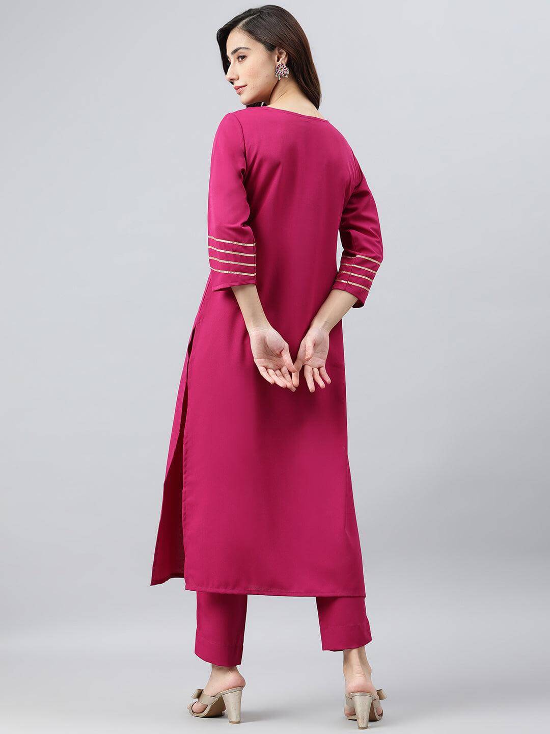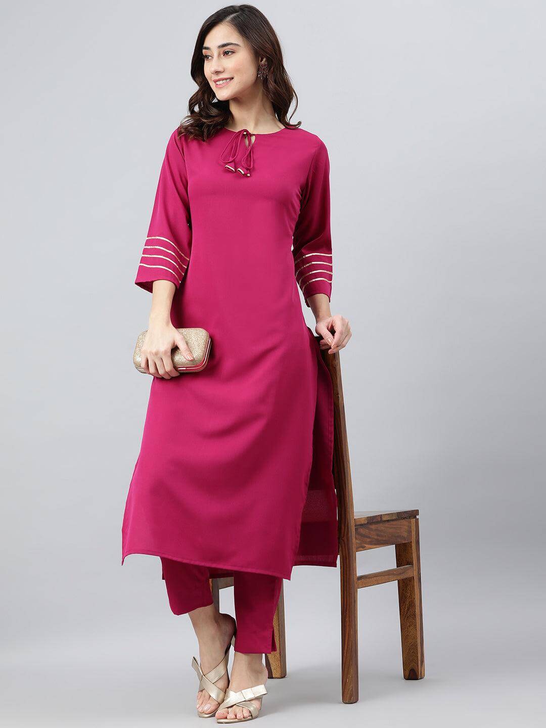 - Go #hyperpink with this cutting edge magenta colored poly crepe straight kurta set with tie-up neck adorned by tassels. It has gota patti details on Sleeve and tassels. This calf length kurta has 3/4 Sleeve.
