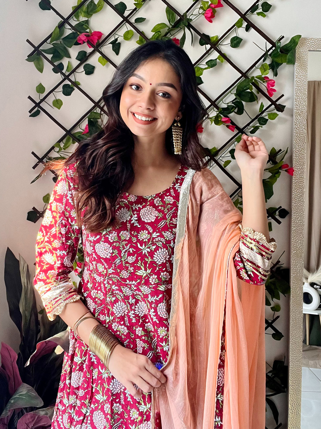 Maroon Cotton Floral Block Print Kurta with Pant and Dupatta
