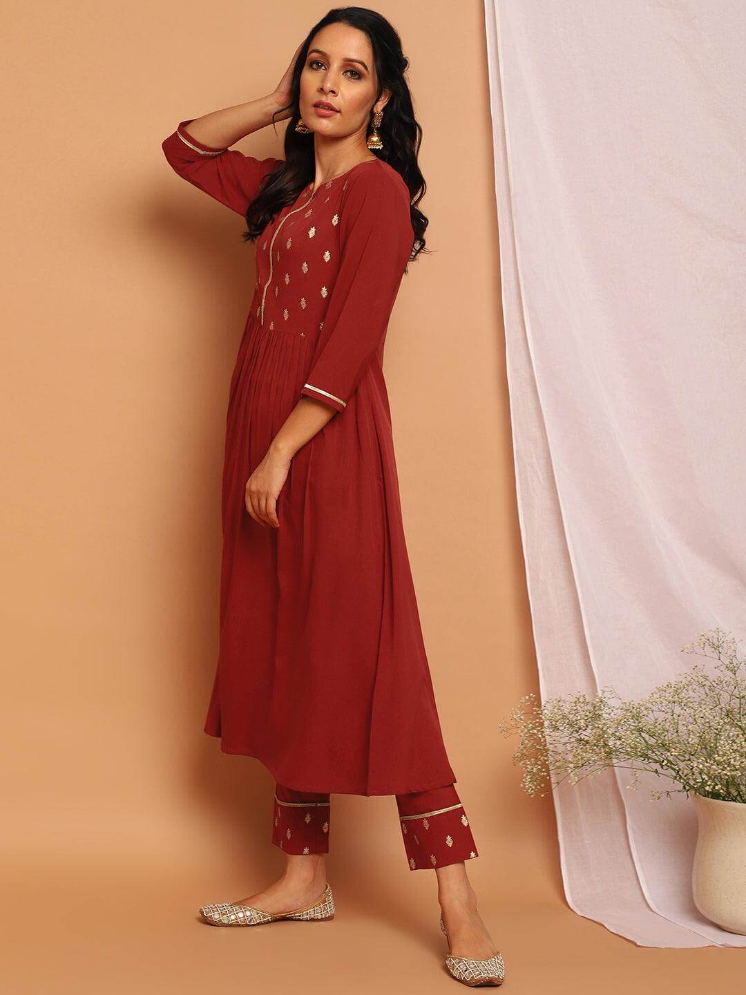 - Kurta Length: 47(inch) | Bottom Length: 36(inch) | Kurta Color: Maroon | Pattern: Ethnic Motifs | Occasion: Casual | Type: Flared | Sleeve Type: 3/4 Sleeves Regular Sleeves