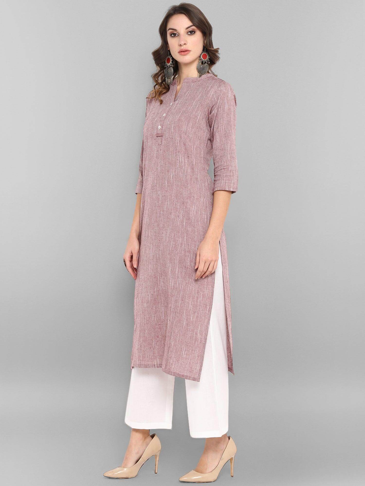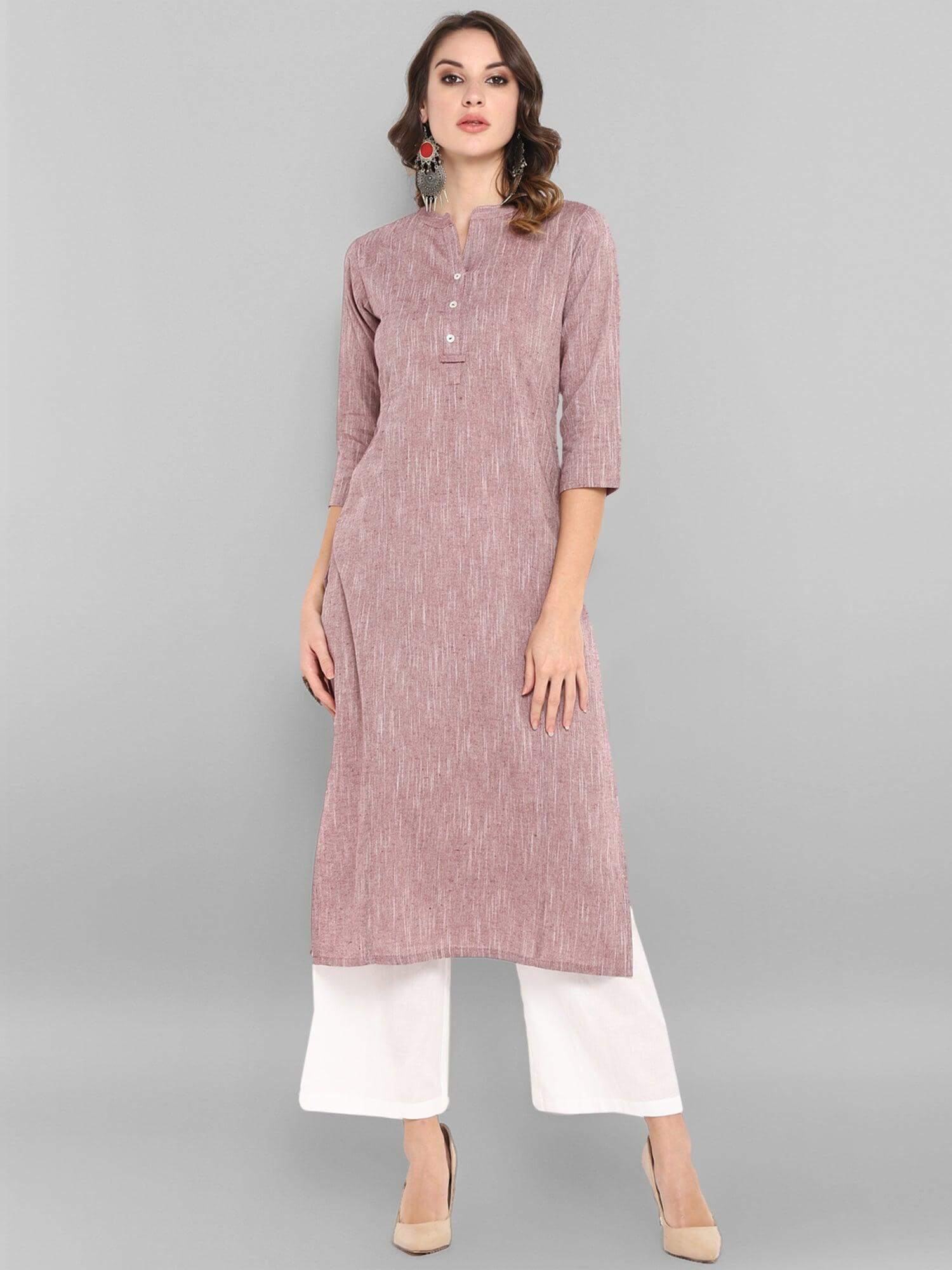 - This stylish solid and button kurta from janasya is made of pure cotton and comes in an attractive wine color. It features 3/4 sleeve,collar neck,straight and it is calf length kurta that is suitable for casual occasions. Team it with matching leggings for a chic look.