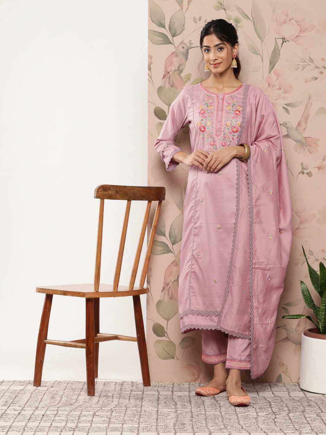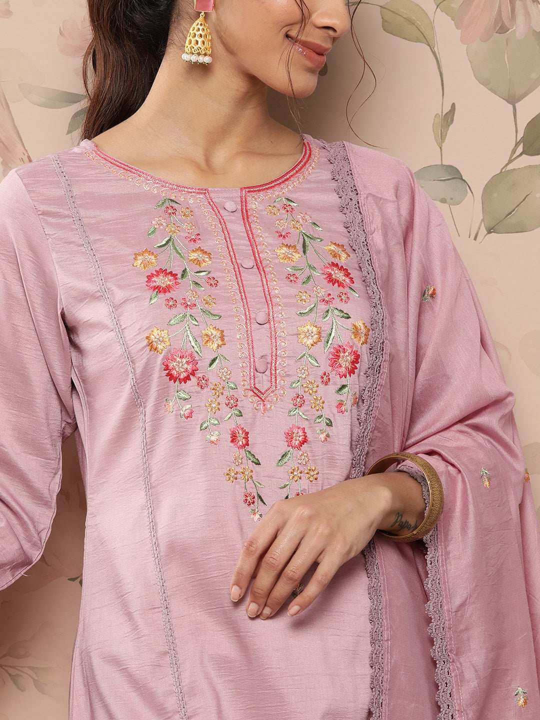 Mauve Poly Silk Floral Embroidery Kurta with Pant and Dupatta