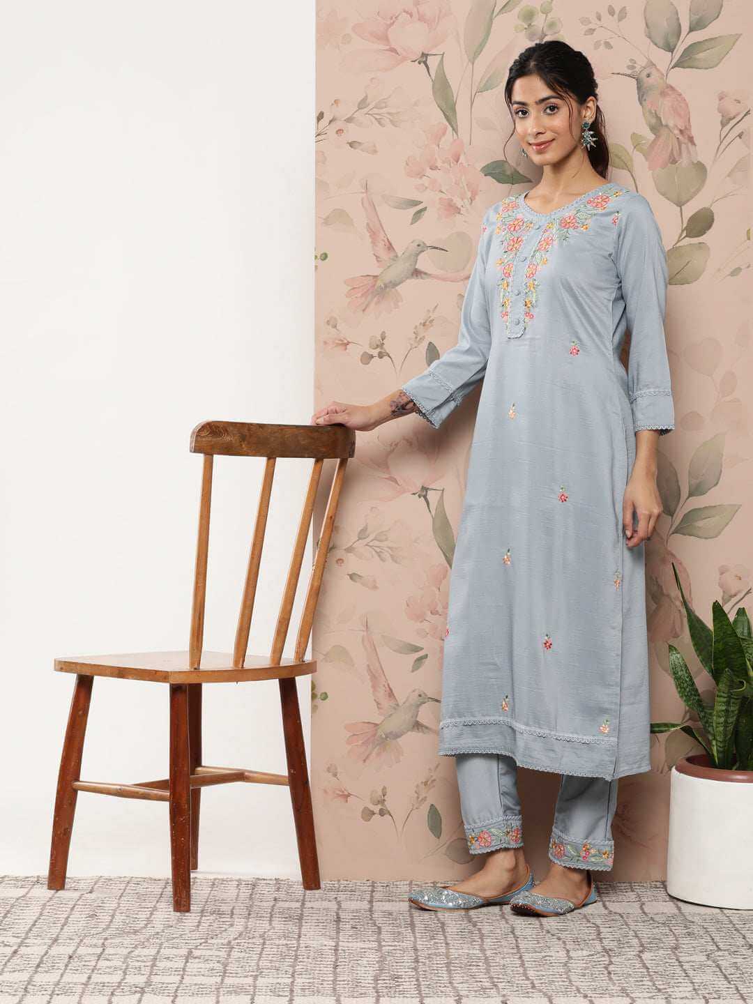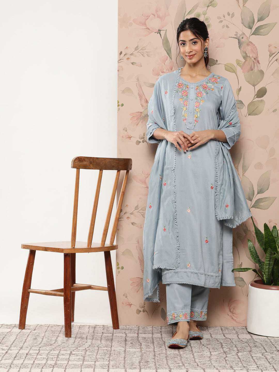 - Kurta Length: 46(inch) | Bottom Length: 38(inch) | Dupatta Color: Mint Blue | Kurta Color: Mint Blue | Pattern: Floral Embroidery | Occasion: Festive | Type: Straight | Sleeve Type: 3/4 Sleeves Regular Sleeves