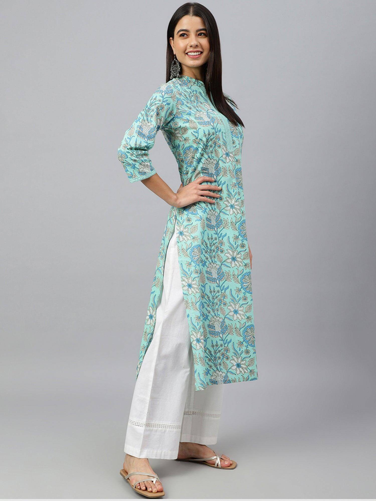 - Bring your style game to perfection with this mint green block printed kurta. It comes with floral prints all over with the delicate lace detailing at the neckline and sleeves hem. It features mandarin neck, 3/4 sleeve and straight fit silhouette
