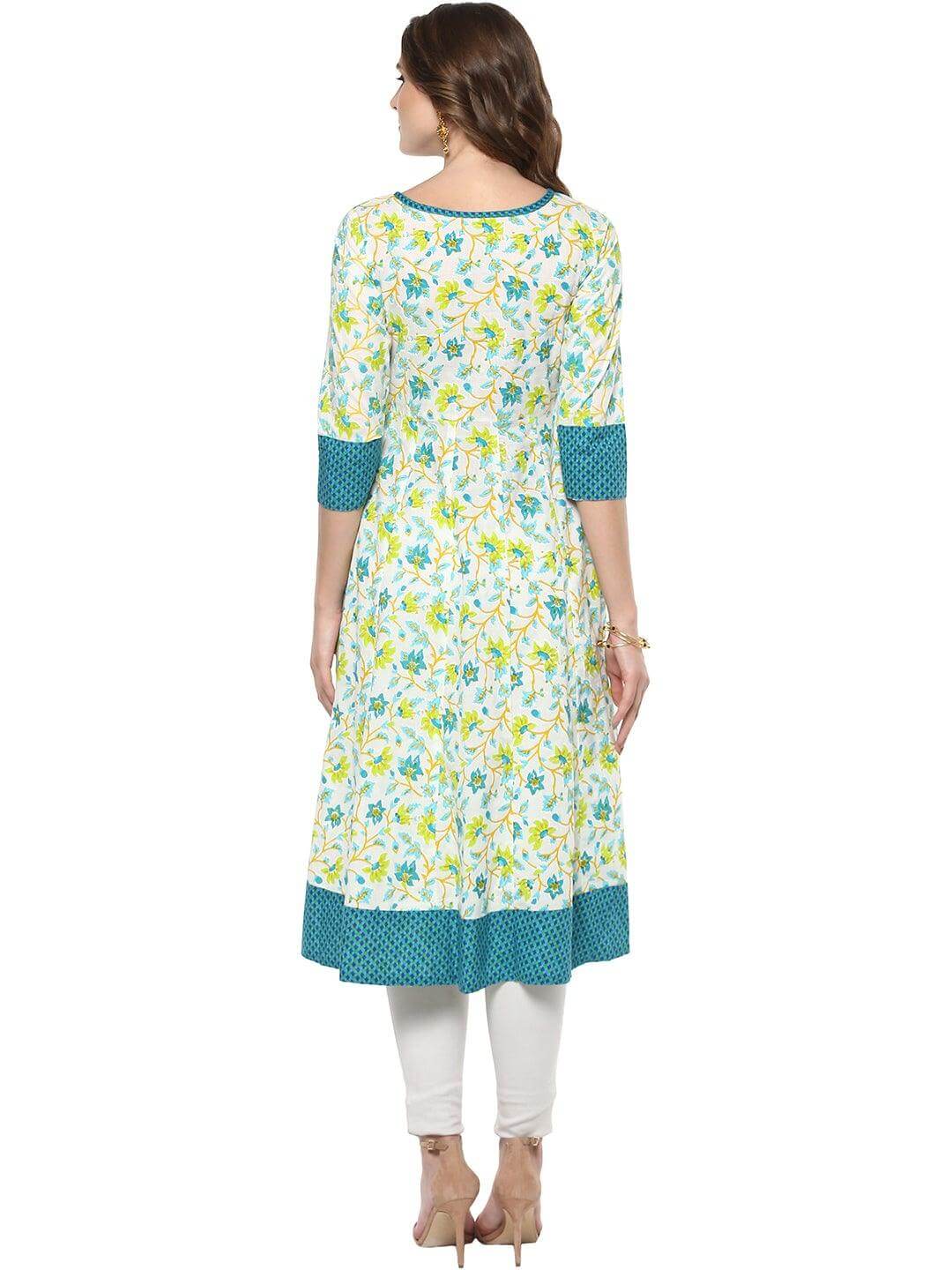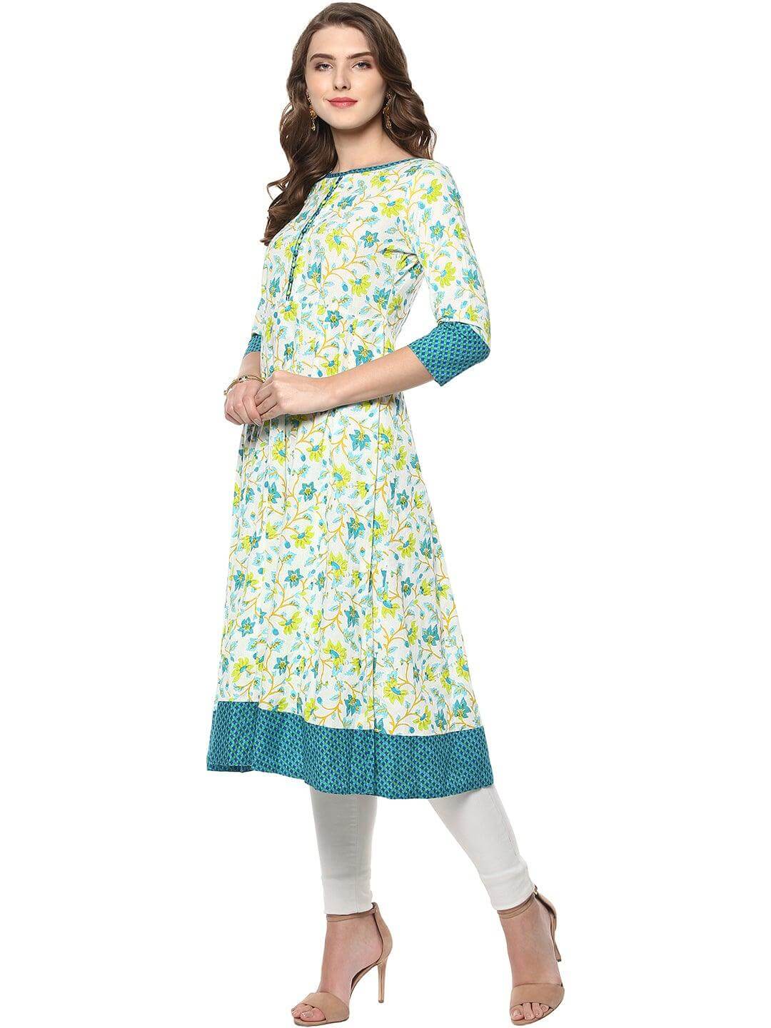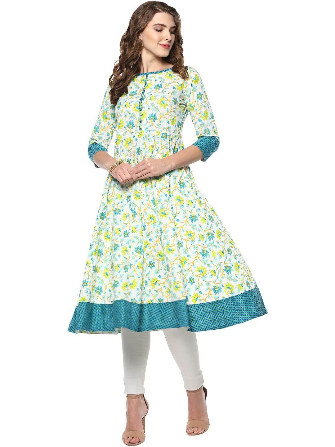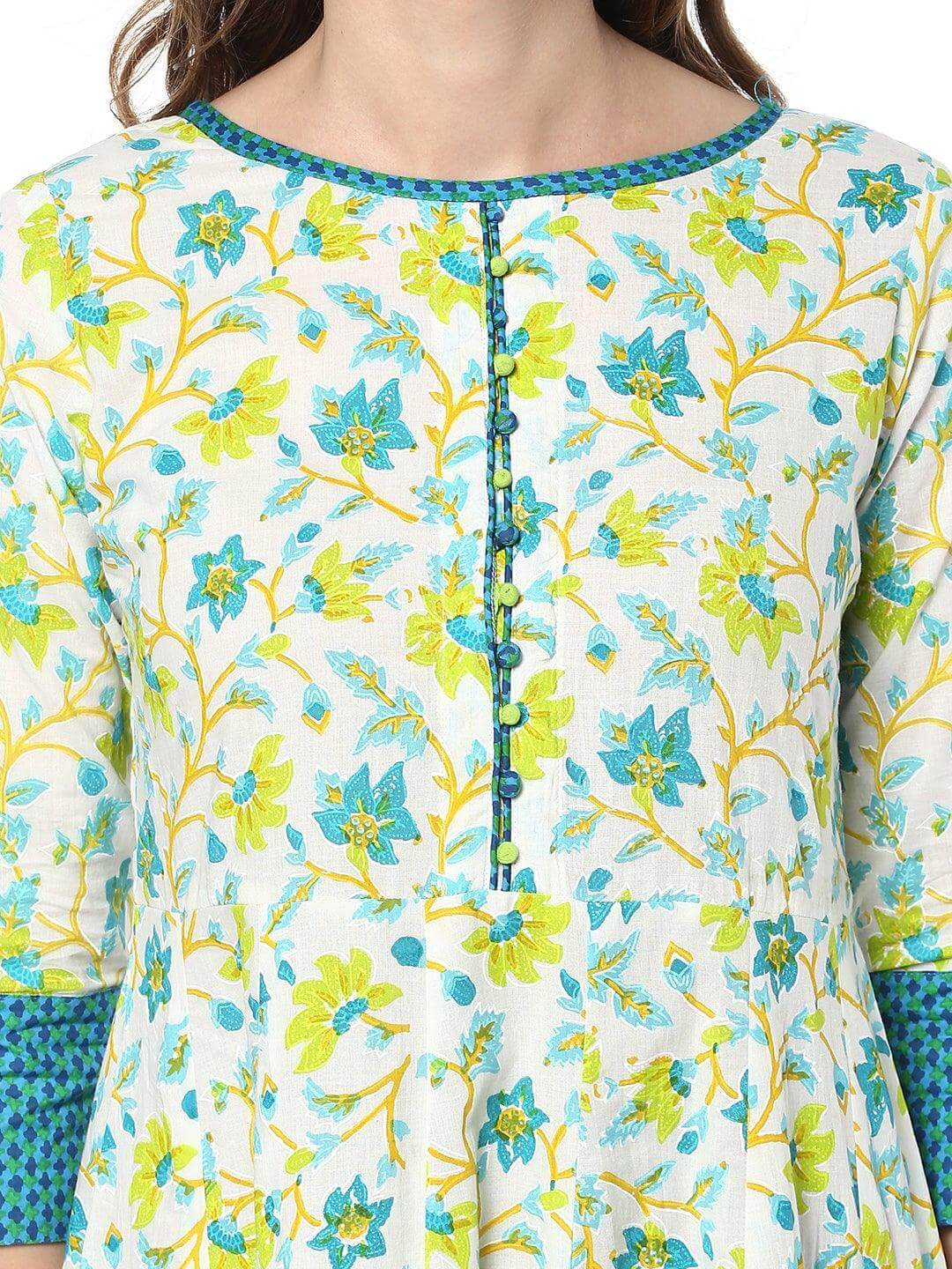 - This stylish floral print kurta from janasya is made of pure cotton and comes in an attractive multicolor. It features 3/4 sleeve,round neck,anarkali and it is cal length kurta that is suitable for casual occasions. Team it with matching leggings for a chic look.