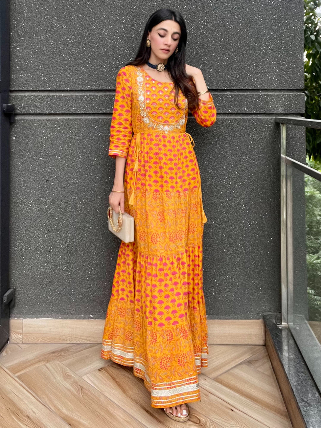 - The mustard cotton printed flared kurta with beautiful embroidery on the yoke, it also has gota patti on the hem and it also has 3/4 sleeves and tassels on the waistline which gives festive look and you can easily pair it with straight pants to get a chic look.