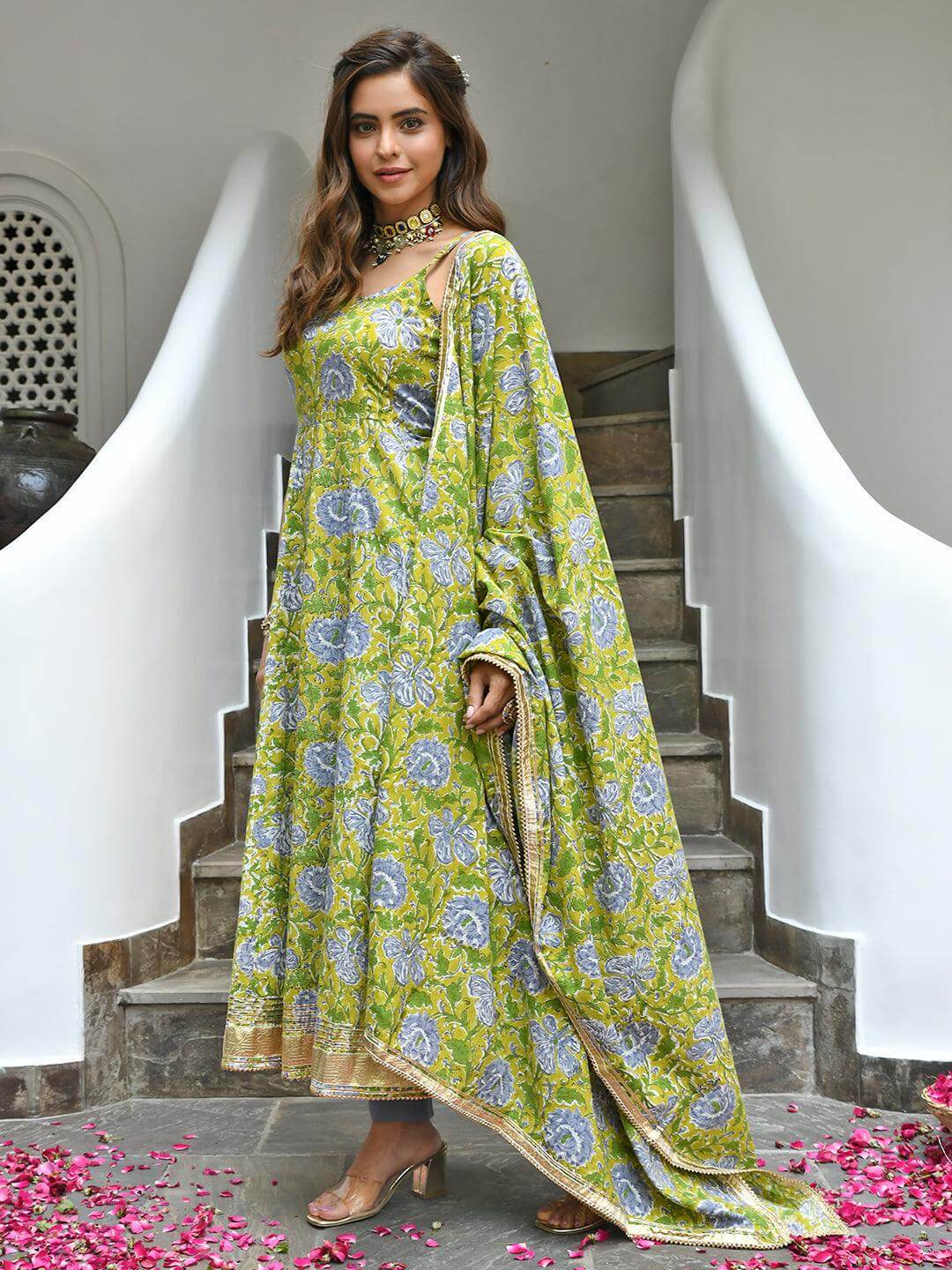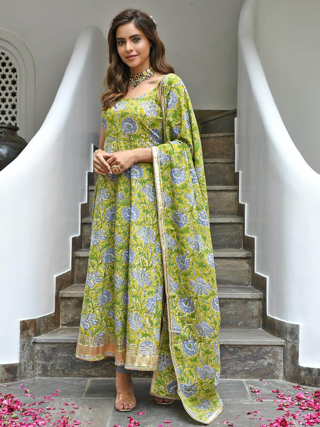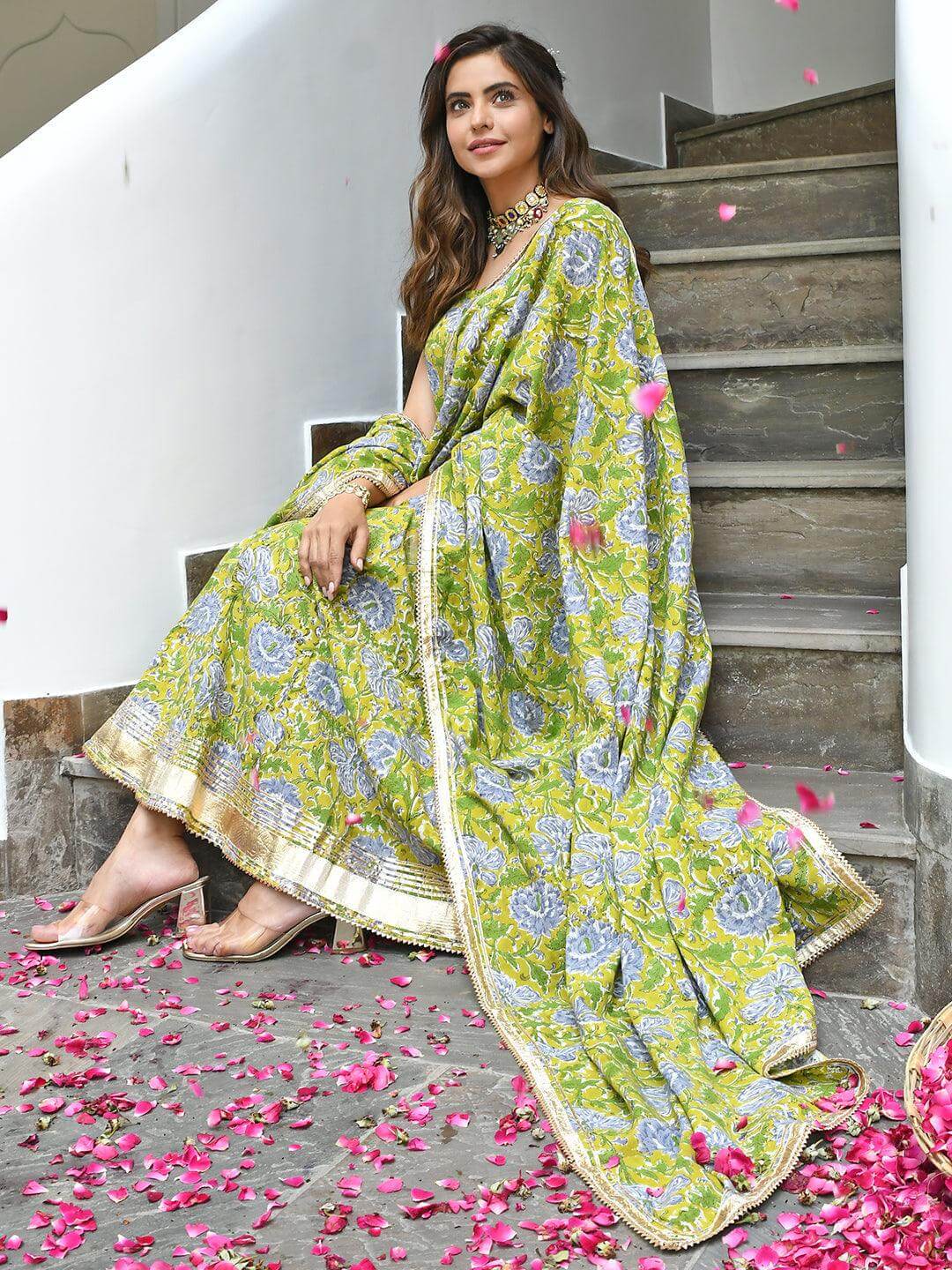 - Bring your style game to perfection with this mustard floral printed cotton kurta pants set with printed cotton dupatta. The kurta comes with all-over floral prints, sleeveless with adjustable straps, and gota-patti detailing on hemline. The cotton grey solid pant is paired with the printed dupatta crafted in cotton fabric with lace detailing at the borders.