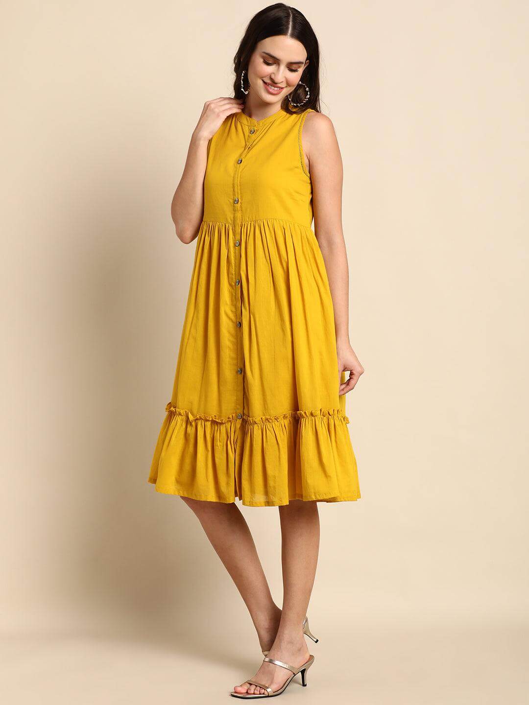 - Style:- Length: 41(inch) | Pattern: Solid | Occasion: Casual | Type: Flared | Sleeve Type: Sleeveless(Sleeveless) | Color: Mustard