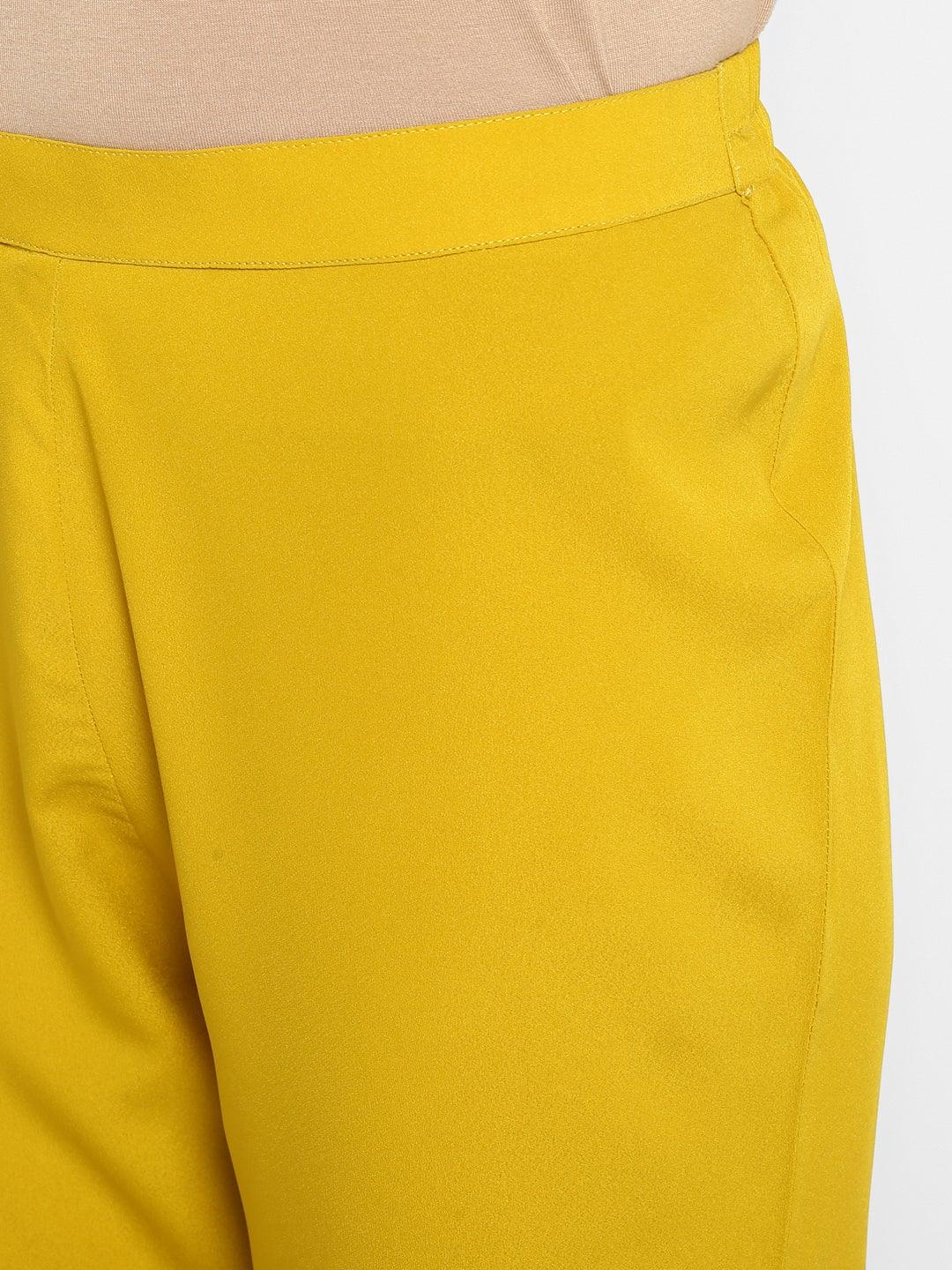 - Flaunt sartorial elegance wearing mustard colored foil print kurta set by Janasya. Look classy and stylish in this piece and revel in the comfort of the soft crepe fabric. It features 3/4th Sleeve, round neck, and is straight calf length kurta. It comes with mustard color narrow pant of poly crepe fabric and art silk dupatta of length 2.25 mtr*1 mtr with tassel detailing on hem. Style it with statement earrings and sandals to complete the look.