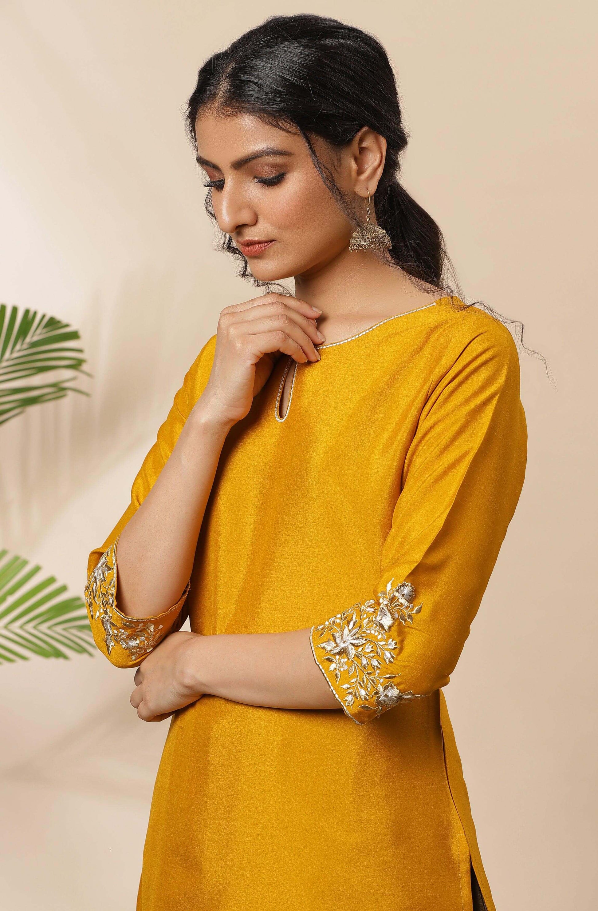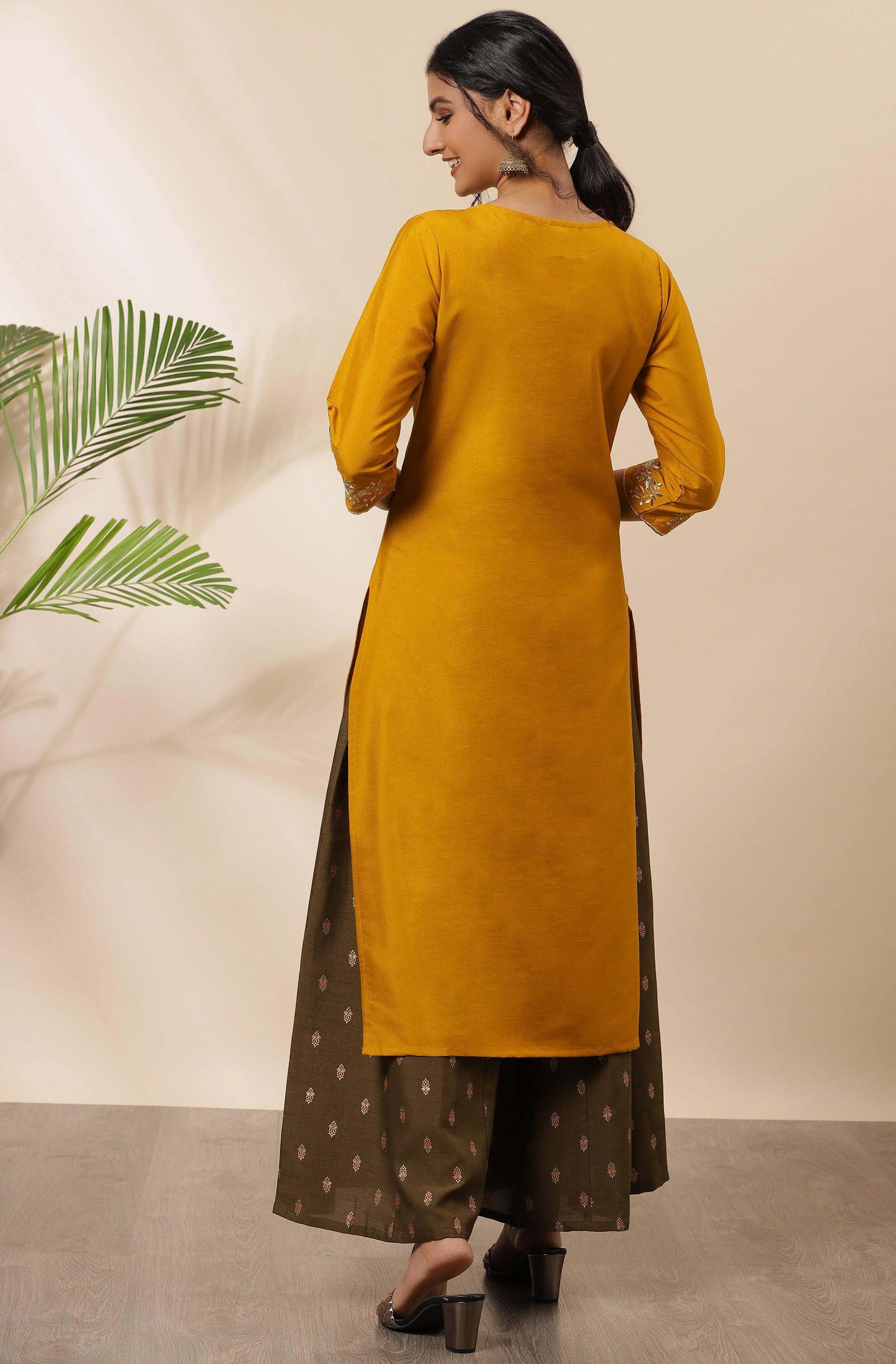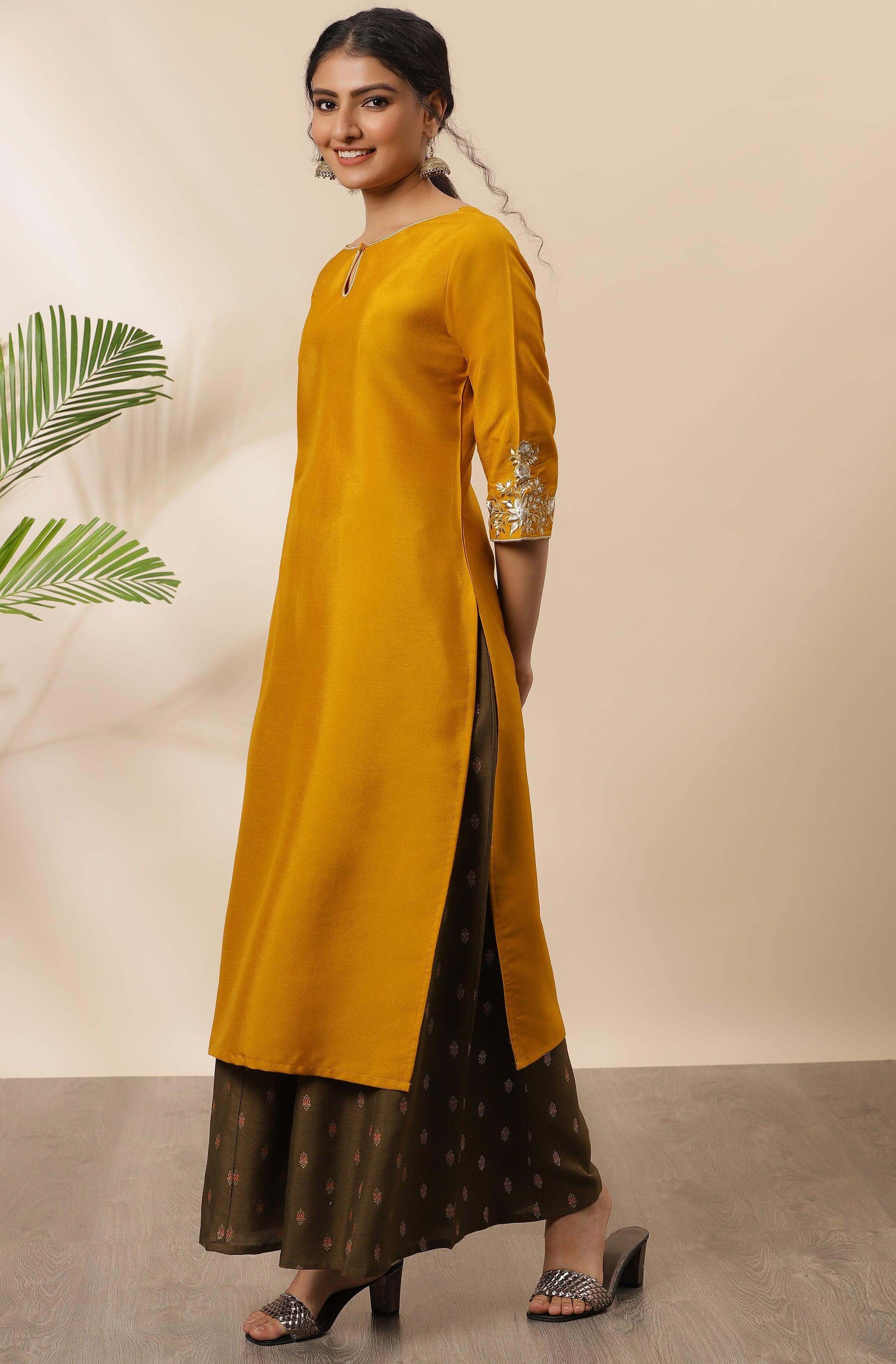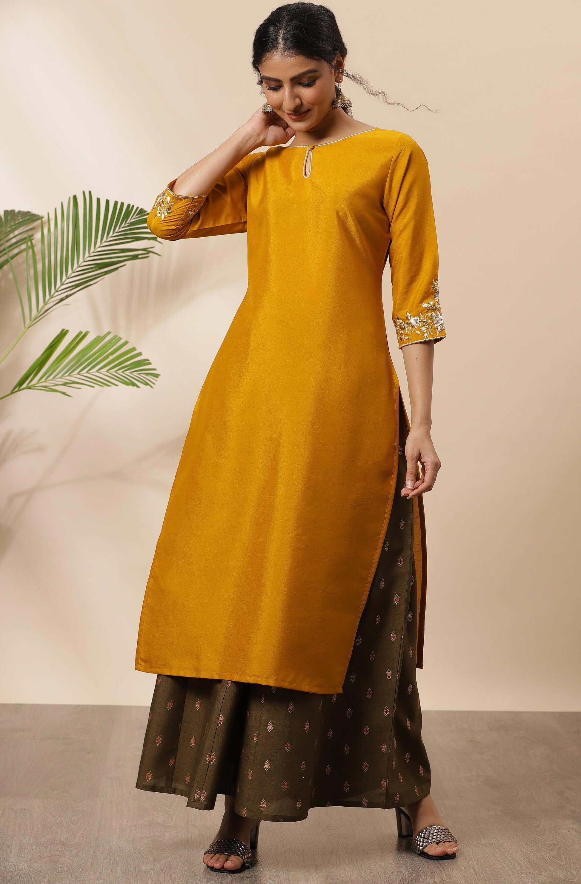 - Give your ethnic wardrobe an elegant touch by this mustard kurta from Janasya. This kurta crafted in poly silk with off-white and gold embroidery and button detailing on keyhole neckline giving it a contemporary touch. Team it up with danglers and ballerina flats for complete look.