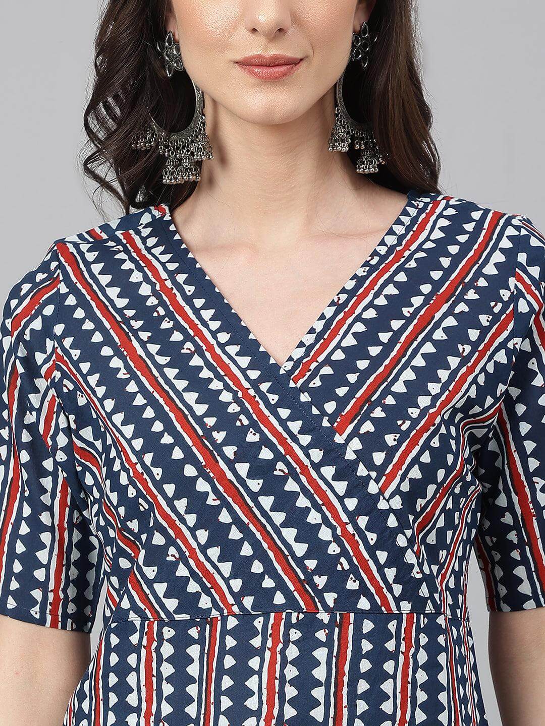 - Navy blue cotton geometric print straight kurta by Janasya crafted in cotton fabric featuring overlapping v-neck, half sleeves with regular fit.