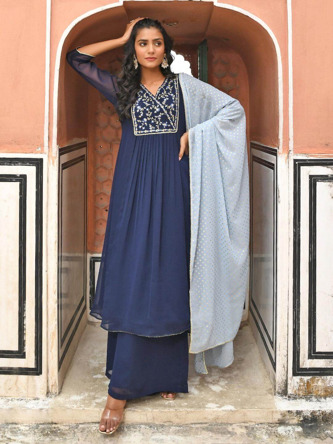 - A three-piece set for you to get all dolled up this festive season to shine brighter than the stars! This navy-blue kurta pant set is crafted into fine georgette fabric featuring v-neck with delicate embroidery on yoke, 3/4 sleeves, flared silhouette adorned with gota detailing at the hemline and sleeve hem. It is paired with pastel blue georgette dupatta featuring delicate foil prints all over with gota detailing over borders.
