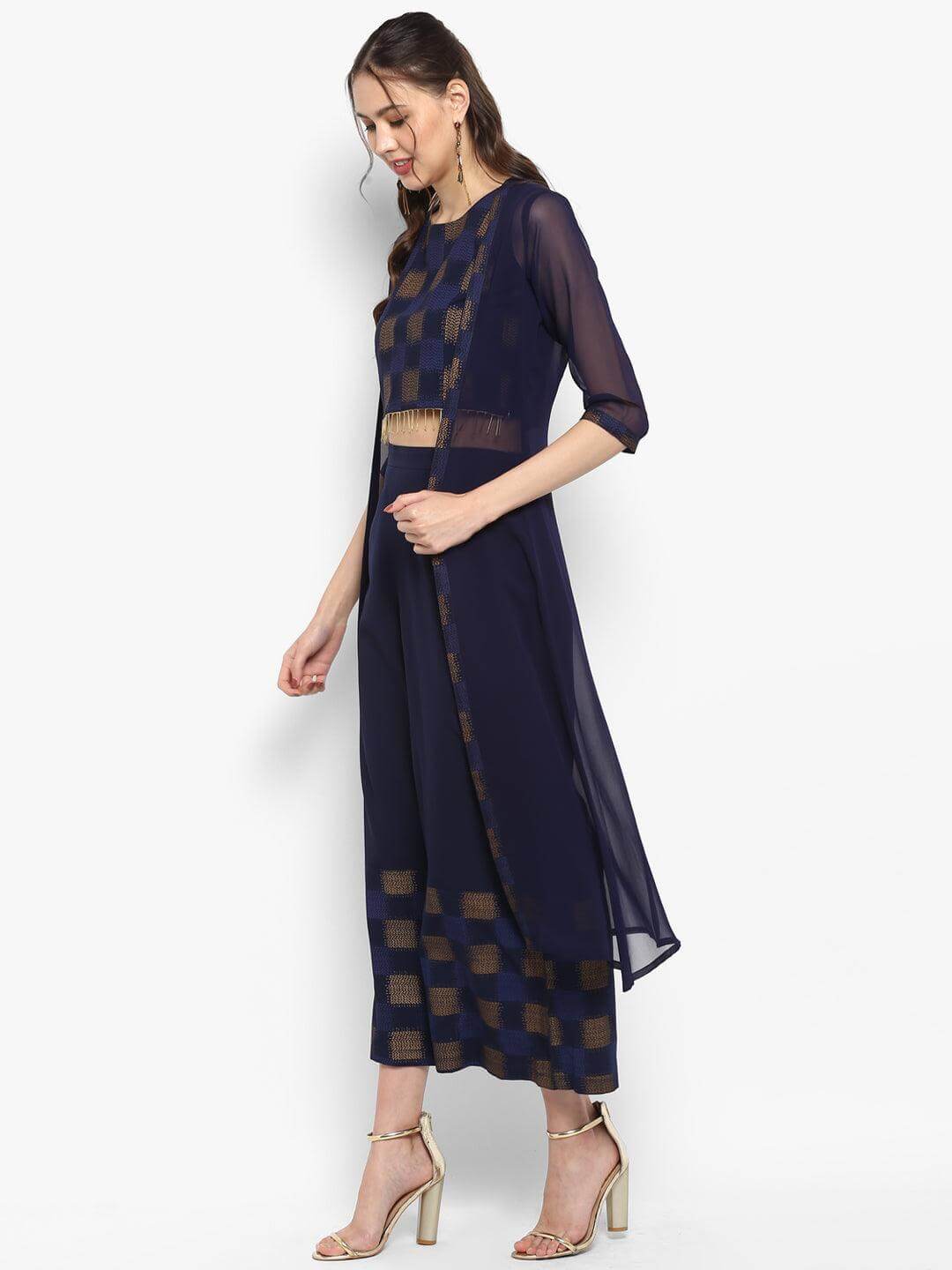 Navy Blue Poly Crepe Gold Print Top with Palazzo and Jacket