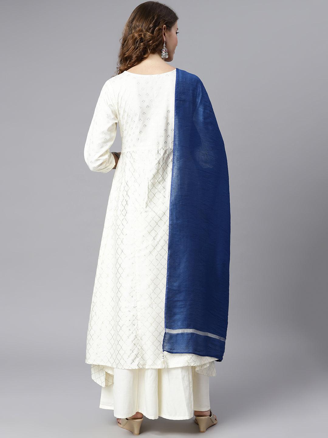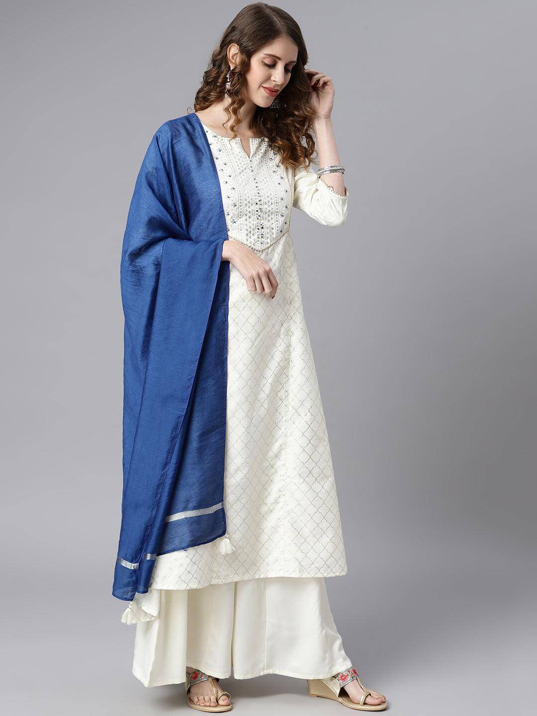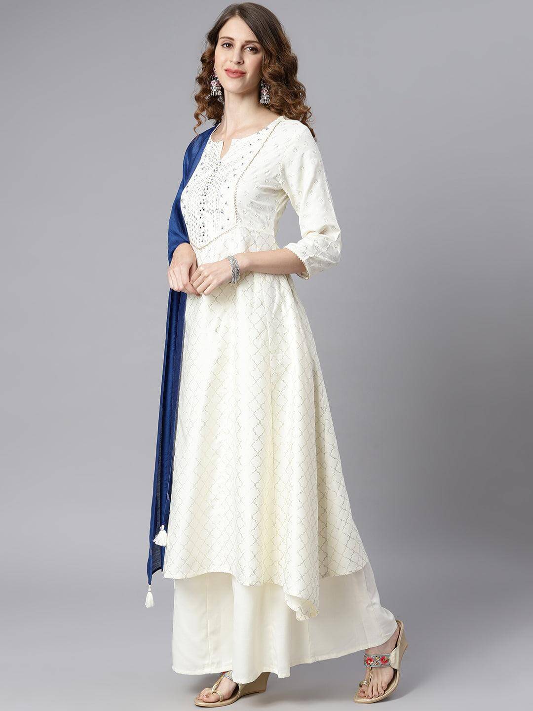 - Kurta Length: 48(inch) | Bottom Length: 41(inch) | Dupatta Color: Blue | Kurta Color: Off- White | Pattern: Ethnic Motifs | Occasion: Party | Type: Anarkali | Sleeve Type: 3/4 Sleeves Regular Sleeves