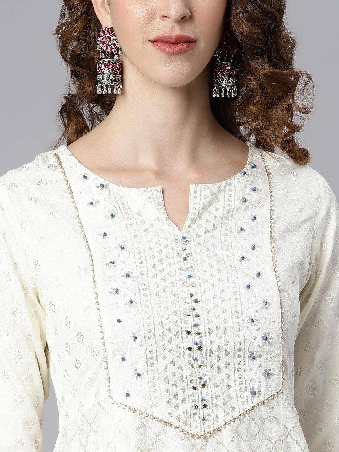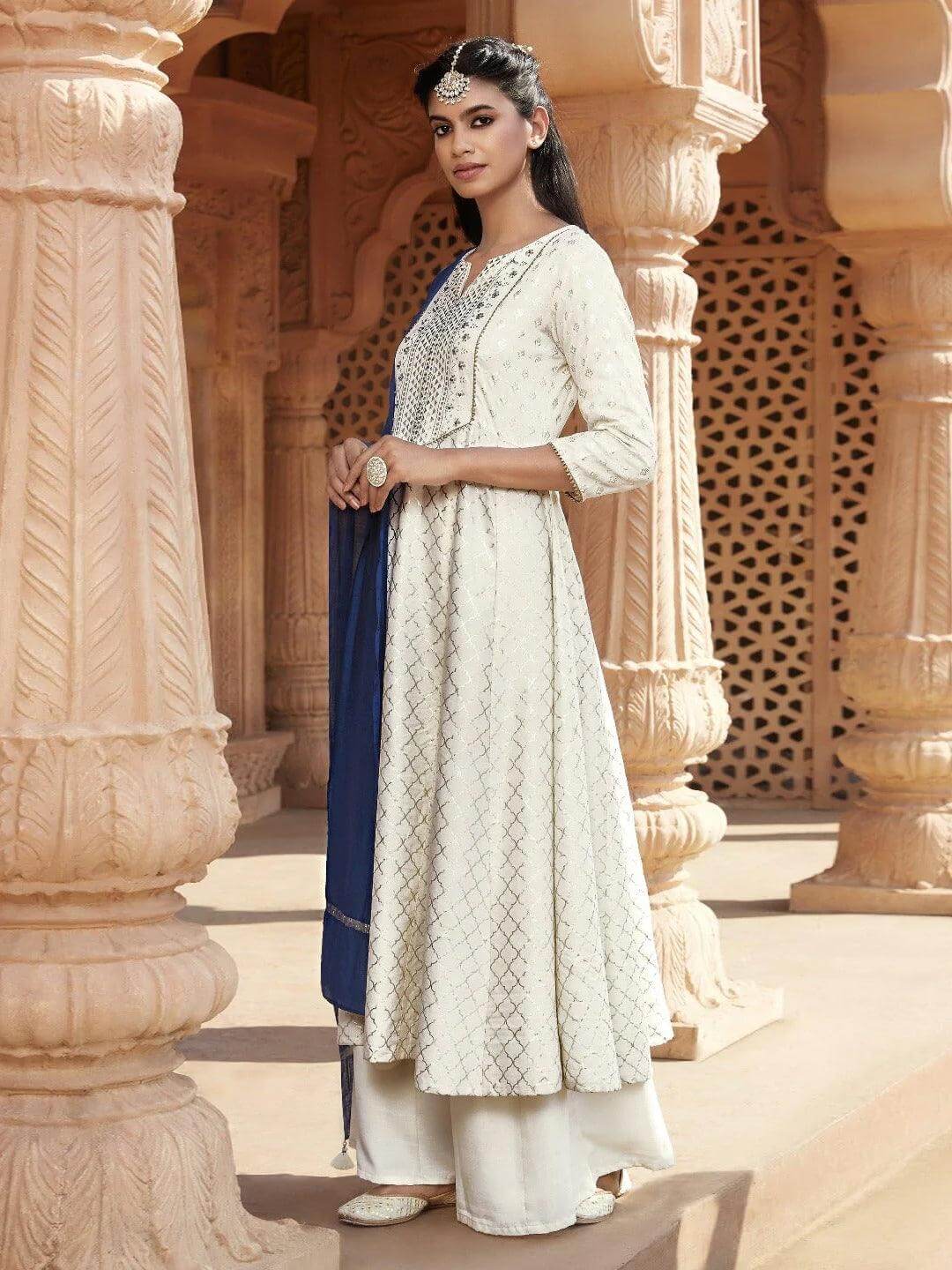 - Classic, serene and flattering, the matchless beauty of white and gold combo stands the test of the time and continually changing fashion winds. Janasya created the magic of this timeless duo in this magnificent masterpiece of anarkali kurta set created in poly silk accentuated with gota lace, blue beads and indian motifs inspired design. Complementing it, is a flared solid palazzo and blue solid poly silk dupatta. Accessorise this classic look with evergreen jhumkas and mojris.