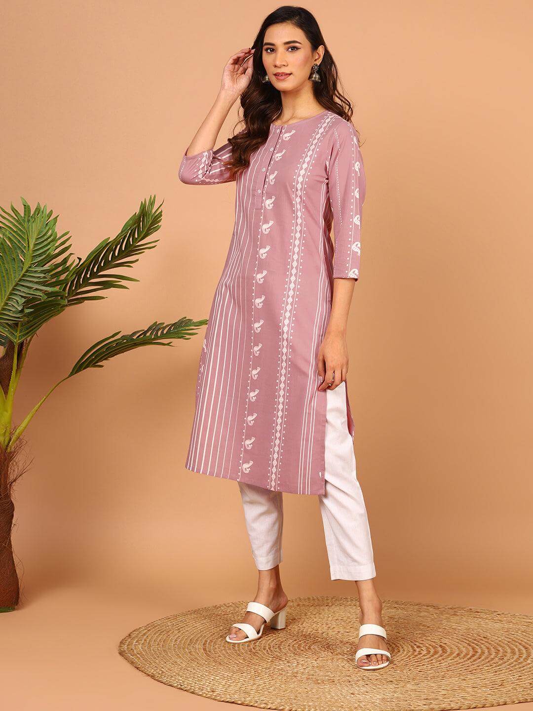 - Get hold of an impeccable look by donning this mauve kurta from Janasya. Tailored to sartorial perfection from premium quality fabric, it assures a soft and soothing touch against the skin. The round neck augments its design. The three-quarter sleeves further speak for itself. The peacock print with ethnic motifs speaks for its ornate artistry.