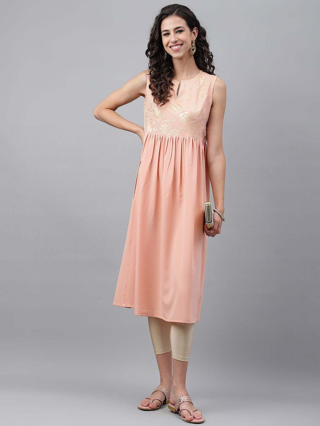 - Emphasize your look by styling this peach crepe foil print flared kurta by Janasya. The kurta is crafted in light weight comfortable crepe fabric featuring golden foil prints on yoke, notch neckline, gota-work detailing on neckline with fit and flare silhouette and gathers at the waistline with side slits to add up ease. Pair it with any bottom to complete your festive look.