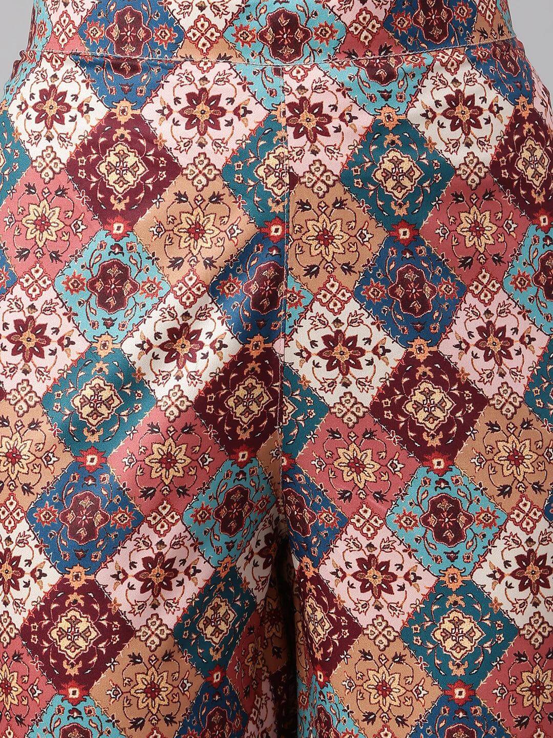 - The peach crepe kurta and printed pant set comes with a straight silhouette and has a printed patch on both sides work which is making the look emphasizing.