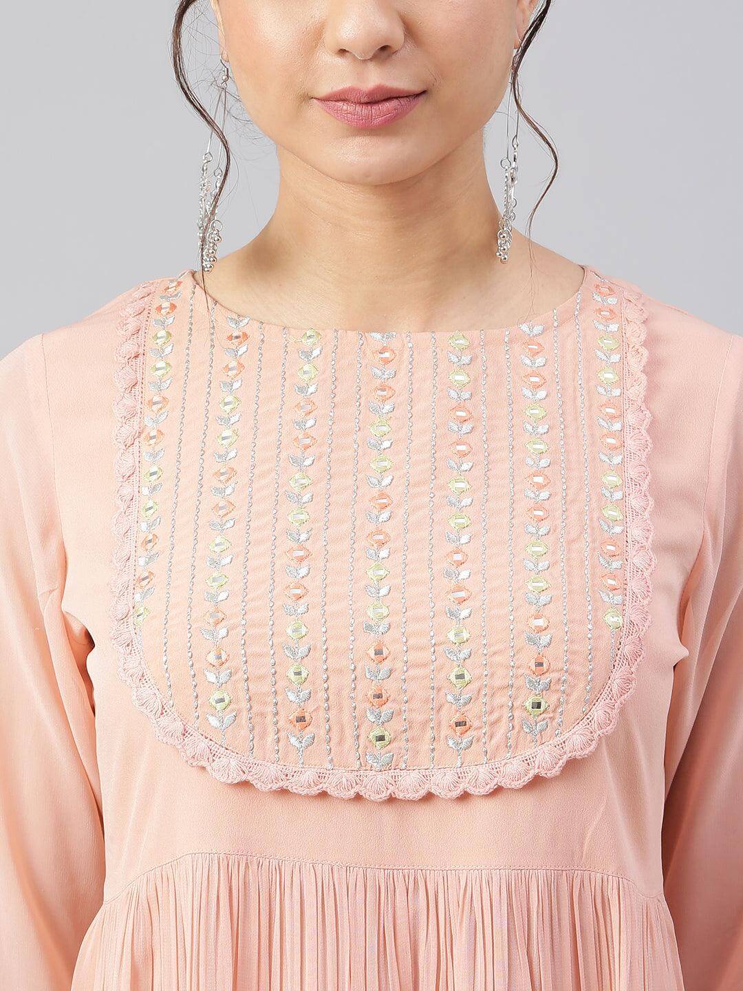 - The peach georgette kurta and sharara set comes with a flowy sillhoute and a detail embroidery work at yoke which is making you festive ready enhancing your grace and elegance