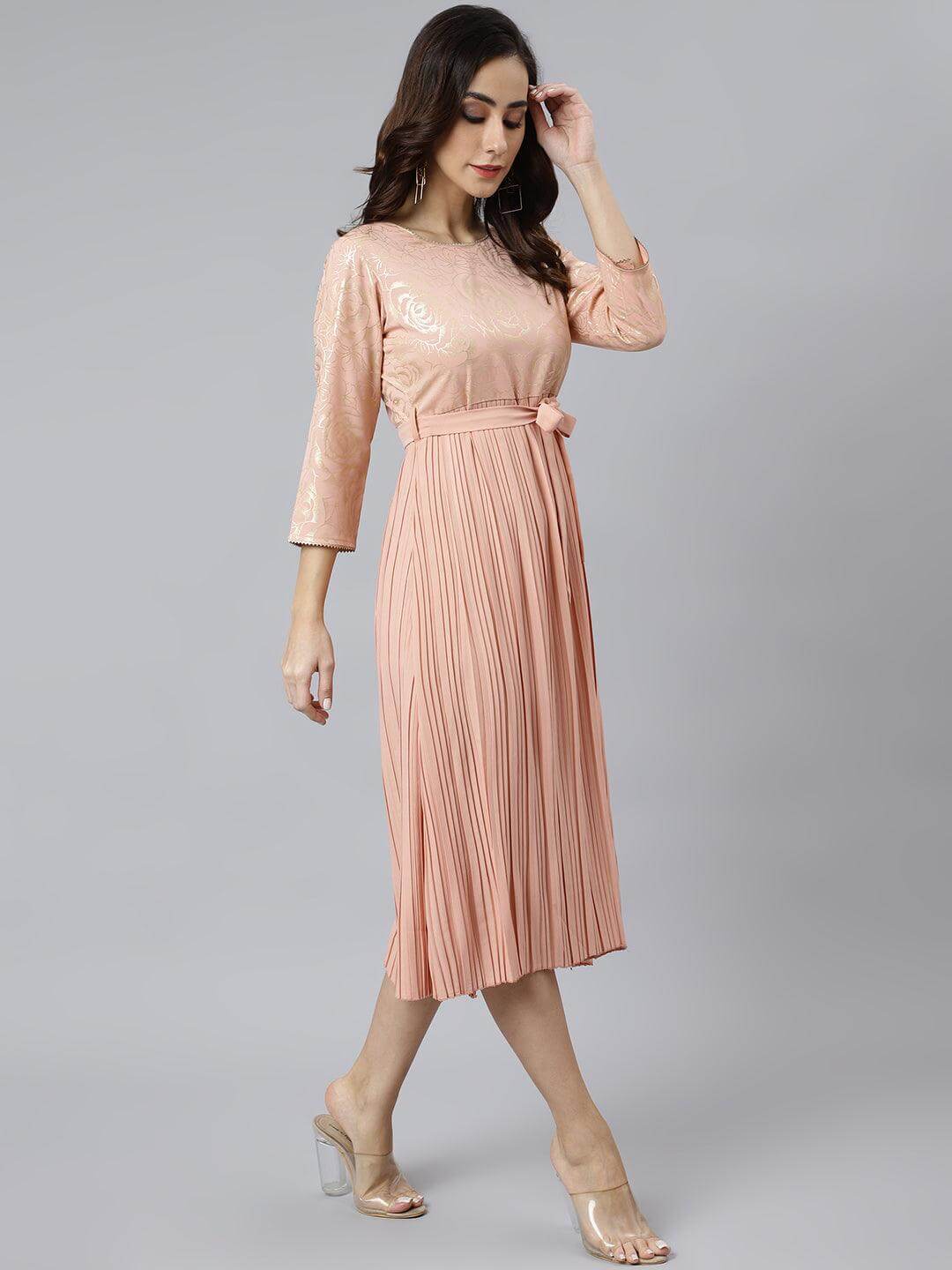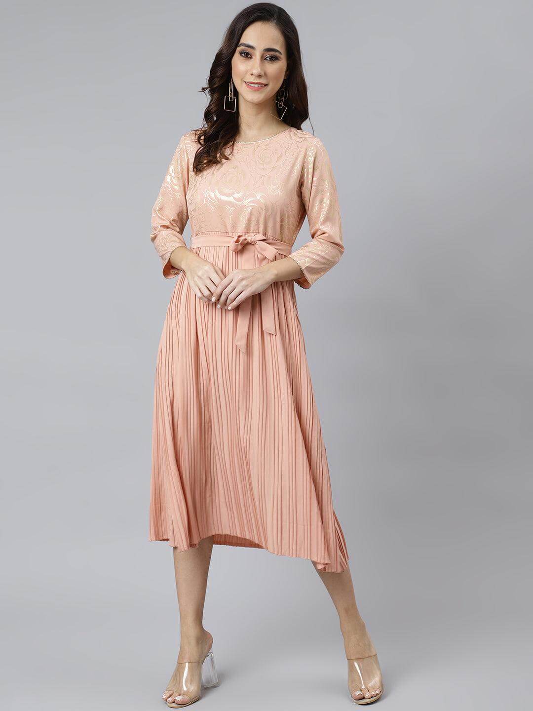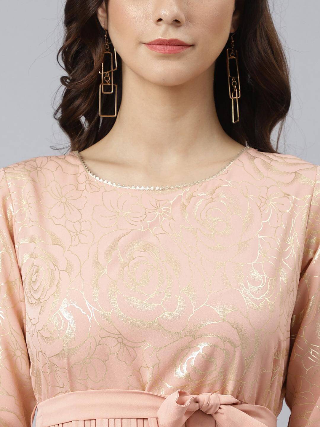- Style:- Length: 45(inch) | Pattern: Botanical Printed | Occasion: Casual | Type: Flared | Sleeve Type: 3/4 Sleeves Regular Sleeves | Color: Peach