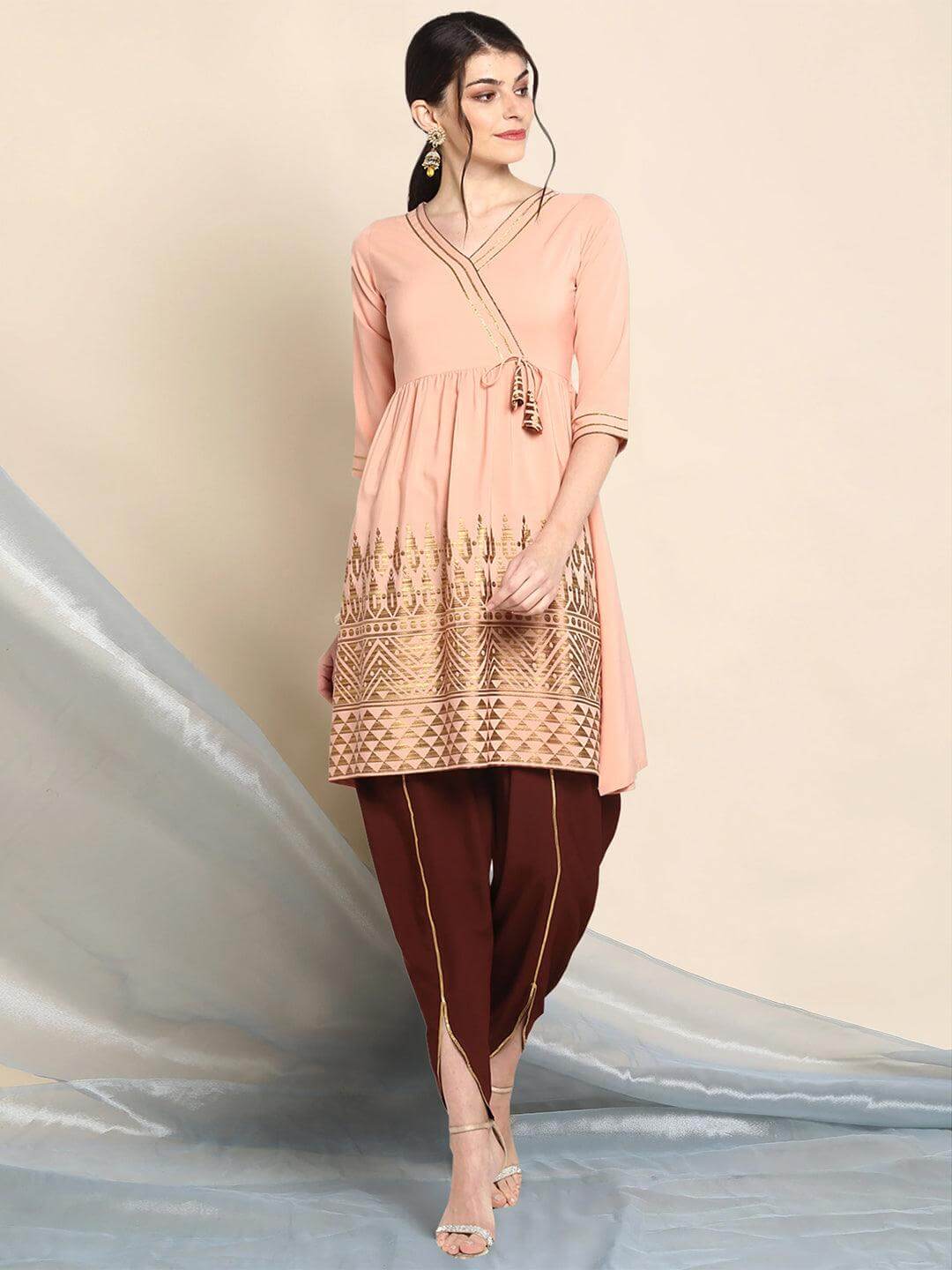 - Kurta Length: 39(inch) | Bottom Length: 40(inch) | Kurta Color: Peach | Pattern: Geometric Printed | Occasion: Festive | Type: Flared | Sleeve Type: 3/4 Sleeves Regular Sleeves