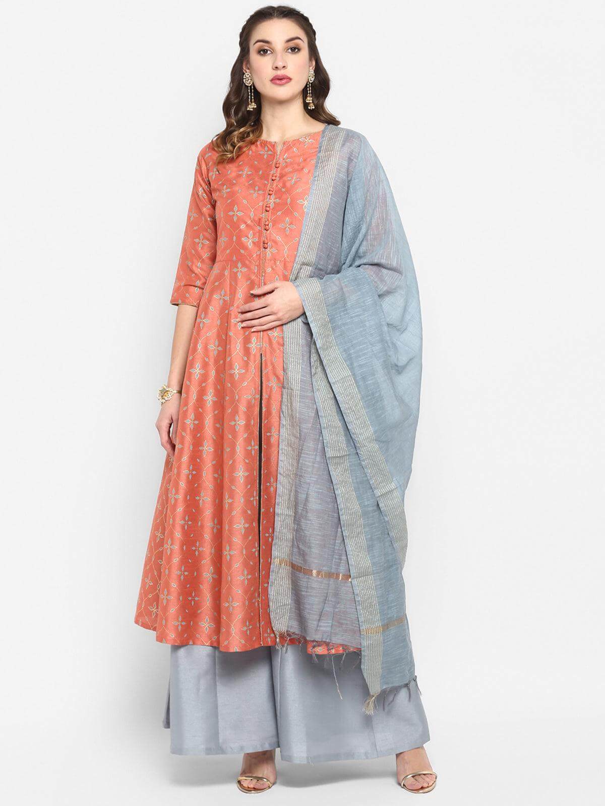 - Kurta Length: 48(inch) | Bottom Length: 39(inch) | Dupatta Color: Grey | Kurta Color: Peach | Pattern: Hand Print,Gold Print,Foil Print | Occasion: Party | Type: Anarkali | Sleeve Type: 3/4 Sleeves 3/4 Sleeve