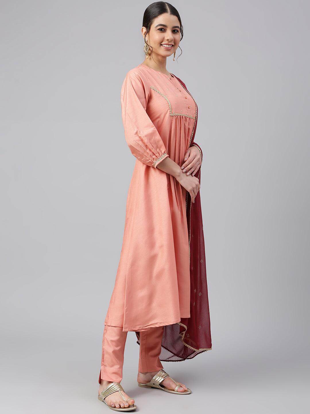 - Kurta Length: 45(inch) | Bottom Length: 37(inch) | Dupatta Color: Maroon | Kurta Color: Peach | Pattern: Solid | Occasion: Festive | Type: Flared | Sleeve Type: 3/4 Sleeves Puff Sleeves